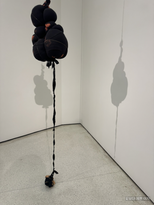 신익 스미스(Shinique Smith)의 2021년 설치 작품 <그녀는 그림자와 영혼 사이에서 은밀히 기다렸다(She Waited Secretly, Between Shadow and Soul)>는 재활용 의류, 리본, 실을 사용하여 천장에서 바닥까지 수직으로 뻗어 있다.