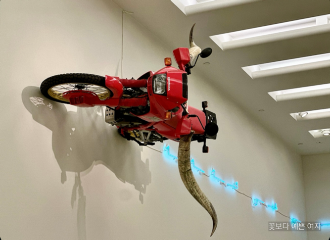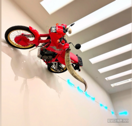 마리오 메르츠(Mario Merz)의 작품 <ACCELERATION = DREAM, FIBONACCI NUMBERS IN NEON AND MOTORCYCLE PHANTOM> 은 갤러리 벽에 높이 설치된 빨간색 혼다 도미네이터 오토바이와 그 뒤를 따르는 네온 숫자로 구성된 설치 미술이다.