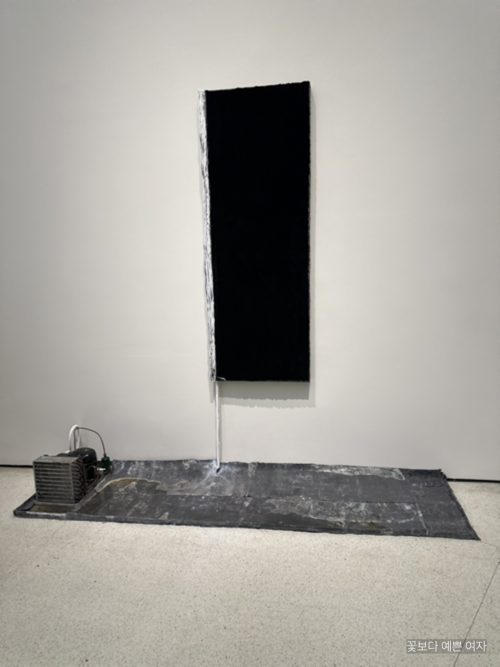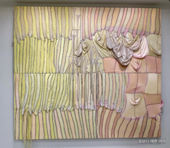 부드러운 파스텔톤 색상과 대규모 회화 같은 구성의 앤서니 아킨 볼라(Anthony Akinbola)의 2021년 작품 <Jubilee>는 아프리카계 미국인의 역사적 사건인 노예 해방 선언문을 참조했다. 또한, 이 작품에 사용된 천은 흑인 문화에서 중요한 머리 덮개인 듀라그(durag)로 만들어졌다. 패널의 일부는 팽팽하게 당겨져 주름이 생기고, 다른 부분은 느슨하게 부풀어 오른다. 신체를 보호하는 직물의 특성을 통해 강인함과 연약함을 동시에 느끼게 한다.