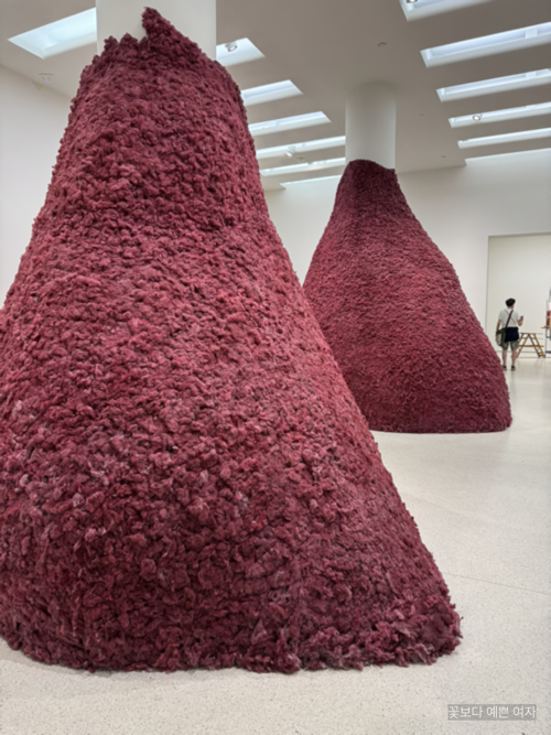 장엄한 자줏빛으로 염색된 폴리에스테르 섬유로 두 개의 거대한 산을 만든 마로 미칼라카코스( Maro Michalakakos)의 <오! 행복한 날들 (Oh! Happy Days, Oh! Les Beaux Jours)>이다.