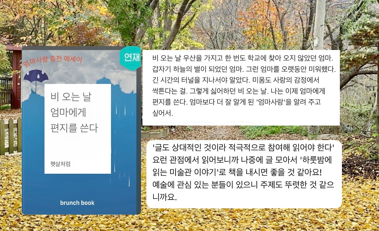 <하룻밤에 읽는 미술관 이야기> 제목을 선물해 준, 글을 너무 잘 쓰는 글벗 햇살처럼 작가는 비 오는 날 우산을 가지고 한 번도 학교에 찾아오지 않았던 엄마, 어렸을 적 갑자기 하늘의 별이 되었던 엄마, 그런 엄마를 오랫동안 미워했지만 이제 엄마에게 편지를 쓰고 있다. 나 또한 따뜻하게 응원해 주고 있다.