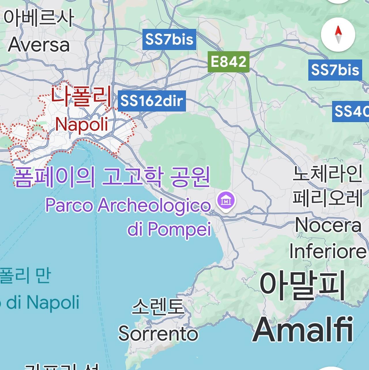 나폴리에서 아말피 해안으로 향하기 전에 꼭 가고 싶던 폼페이 (Pompei)다. 그런데, 지금은 이탈리아인이 살고 있는 신시가지를 폼페이라 하고 유적이 있는 폼페이는 스카비 디 폼페이(Scavi di Pompei, 폼페이 발굴지)라 부르므로 유적을 보려면 역을 잘 찾아가야 한다.