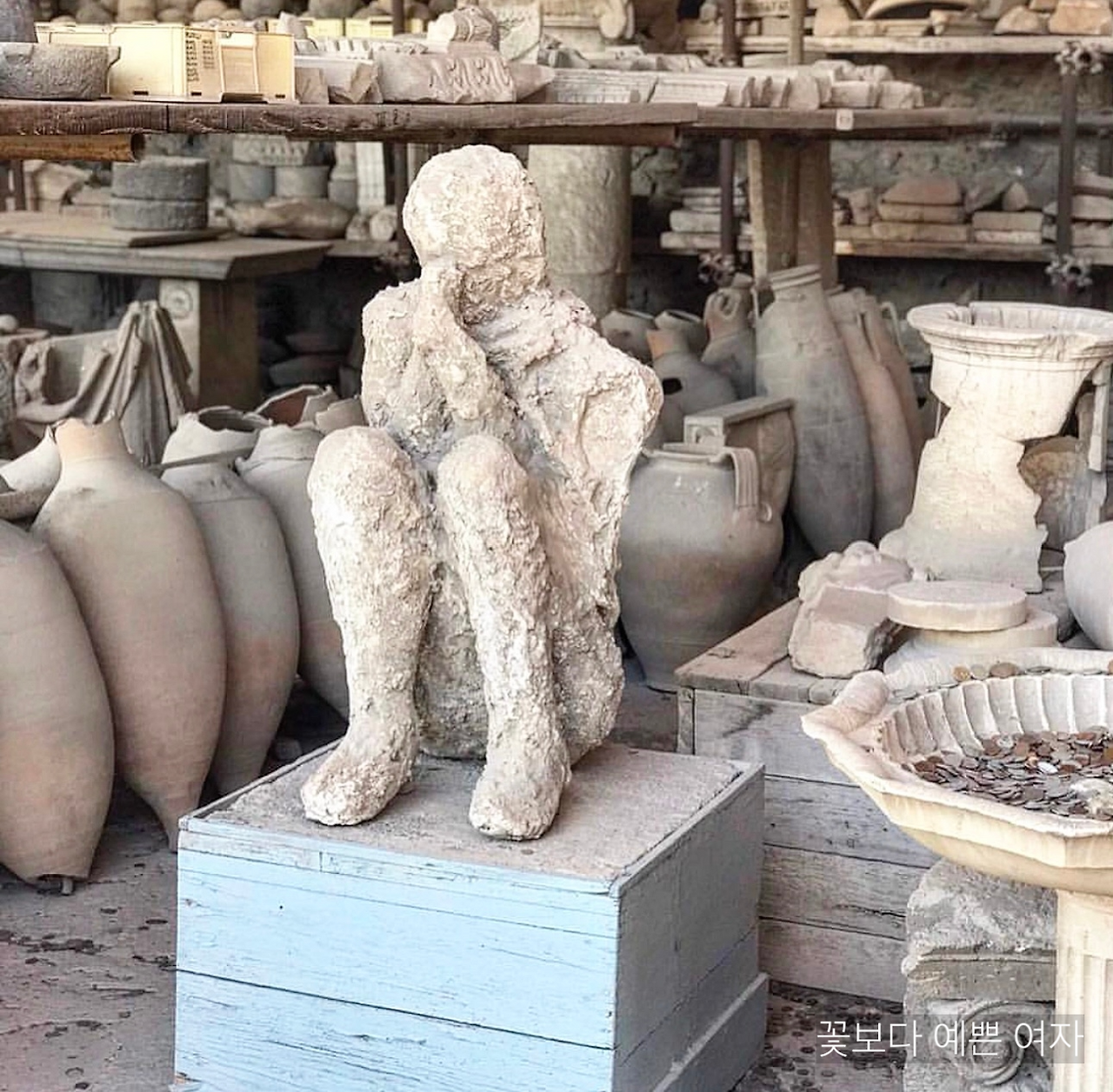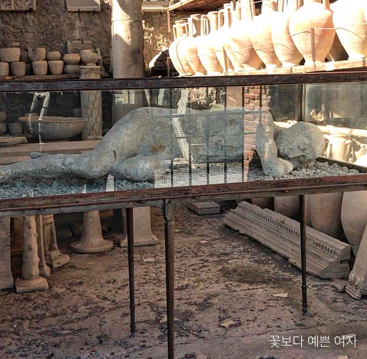 폼페이 사람들은 화산 폭발 시에 순식간에 몰려온 화산재 속에, 생의 마지막 순간의 모습 그대로 파묻혔다. 찰스 디킨스는 <Pictures from Italy>(1846)이라는 이탈리아 여행 기행에서 폼페이 유적과 화산재 속 시신을 ‘멈춰버린 시간 속의 비극적인 순간’이라고 묘사했다.