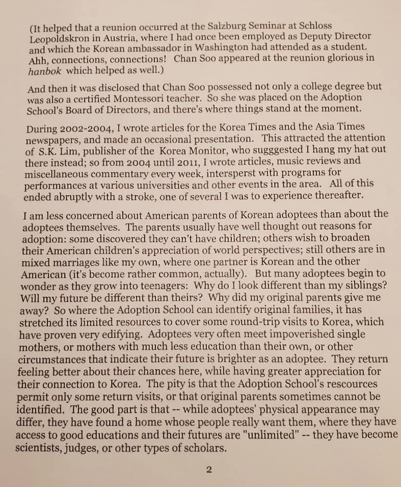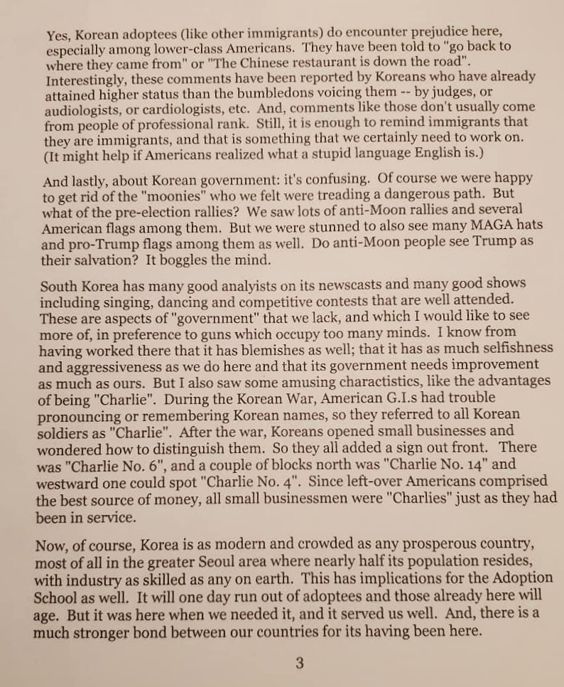 한국이 가지고 있는 외교 자산의 하나는 한인 입양아를 포함한 전 세계에 흩어져 사는 해외 한국인들이 아닐까 한다. 한국정부와 한국 사회가 이들에게 관심을 가지고 항상 교류와 지원의 문을 열어 놓는다면, 보다 사회에서 성공하는 입양아들이 늘어날 것이다.
