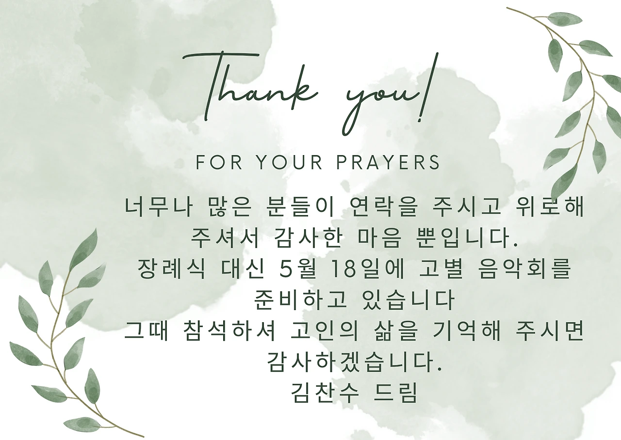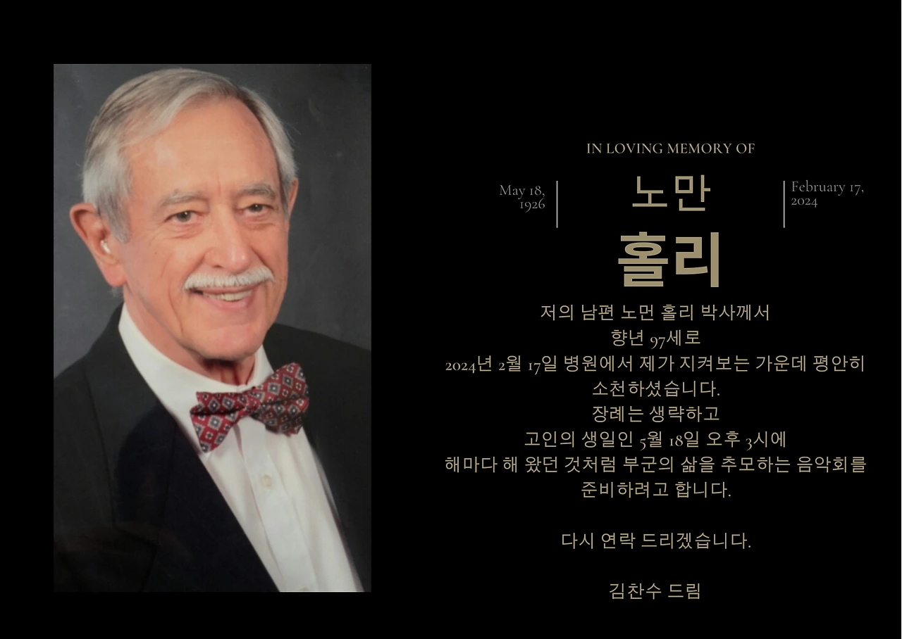 작년 96세 Norman Holly 씨 생신 때는 음악회에 참석하지 못하는 안타까움을 담아 장미꽃을 정성스럽게 만들어 두 분께 선물로 보냈다. 올해는 어떤 꽃을 보낼까 연구 중에 있었는데, 이젠 그 꽃을 달아드릴 할아버지가 이 세상에 안 계시다.