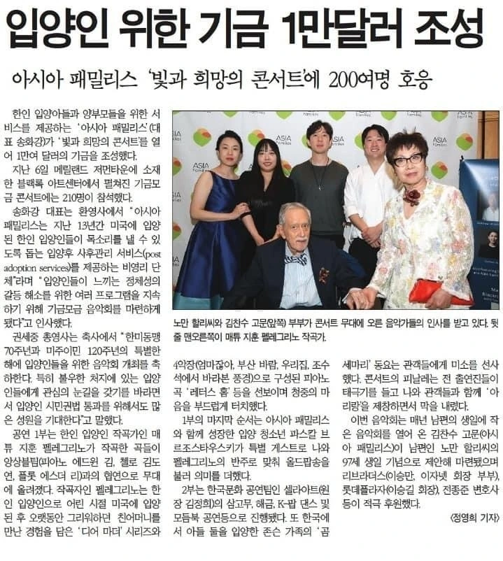 한국에 대한 사랑이 각별했던 미국 할아버지 Norman Holly 박사와 그의 부인 김찬수 전 강원향우회장은 20년이 넘게 한인 입양아들을 위한 봉사를 함께 했다.
