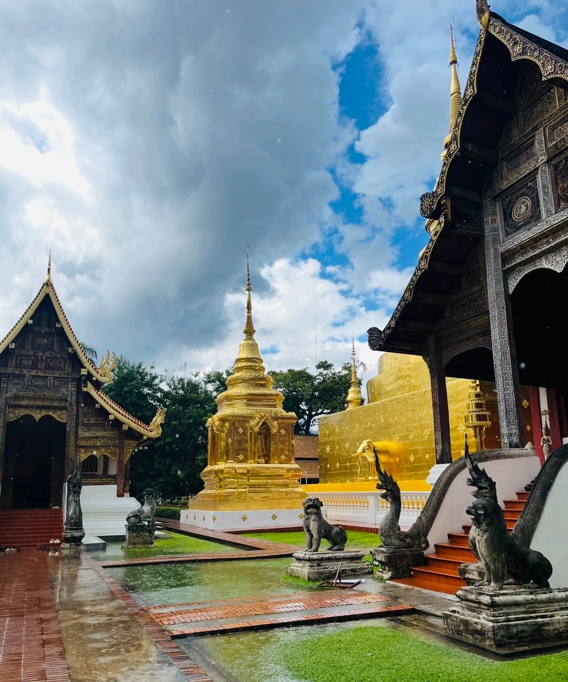 오늘의 목적지인 왓 프라싱이 나왔다. 본당 안에 들어가려고 안내판을 보니 신발을 벗어야 한다고 쓰여있었다. 밖에는 비가 내려 조금 망설여졌지만, 운동화를 벗어 최대한 처마 안의 자리에 내려놓고 본당 안으로 들어갔다.
