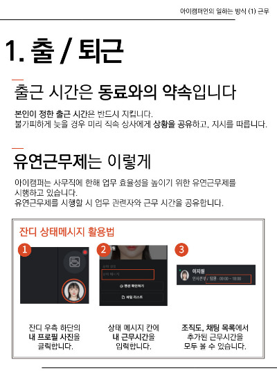 아주 당연한 내용이긴 하지만, 이것을 모두가 볼 수 있는, '배포 가능한' 자료로 제공할 수 있느냐, 아니냐의 차이는 생각보다 크다. 특히 워딩에 '아이캠퍼인'이라는, 조직 구성원들을 하나로 묶는 대명사를 사용함으로서 이 일하는 방식이 개인의 업무방식이 아닌, 아이캠퍼에서는 모두 따라야 하는 조직문화의 일환임을 나타냈다.