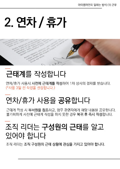 조직문화는 자연스럽게 그 안에서 생기는 경우도 있지만, 소규모 조직에서 급격한 성장세를 겪은 조직의 경우 그 문화를 언어화하는 작업이 필요하다. 초창기 조직문화가 생겨나기 위해선 조직문화를 퍼트려야 하는데, 보이지 않는 문화를 퍼트리긴 위해선 그것을 보이게 하는 작업이 필요하다. 아이캠퍼에서는 그 작업 중 첫 번쨰로 일하는 방식을 담았다.