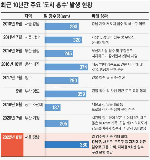 이런 침수피해 및 물난리가 10년이 넘게 지난 지금, 다시금 비슷한 양상으로 나타나는 것은 매우 흥미롭다. 사람의 손이 많이 닿지 않고 인프라가 부족한 시골에서 일어난 피해라면 모를까, 서울은 대한민국 내에서 가장 많은 인프라와 자원이 몰린 곳이 아니던가. 그런 곳에서 10년 전 있었던 피해가 그대로 재현되다니.
