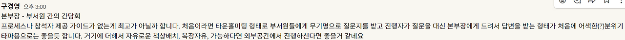이런 작업은 아이캠퍼에도 필요했다. 기존의 전사 차원의 간담회를 진행한 지 1년 여가 지났으며, 그에 비해 인원은 그때에 비해 많이 늘어난 상황이었다. 당연히 새로운 형태의 갈등도 많이 일어났는데, 그중 가장 대표적인 것이 바로 팀과 팀 사이의 갈등, 사일로 효과였다.