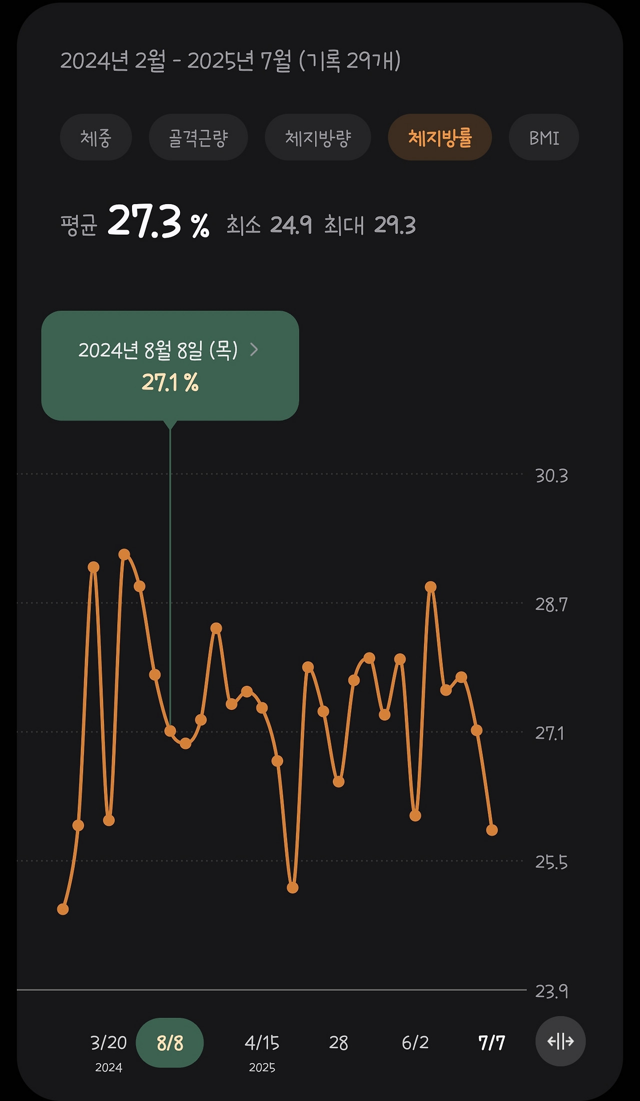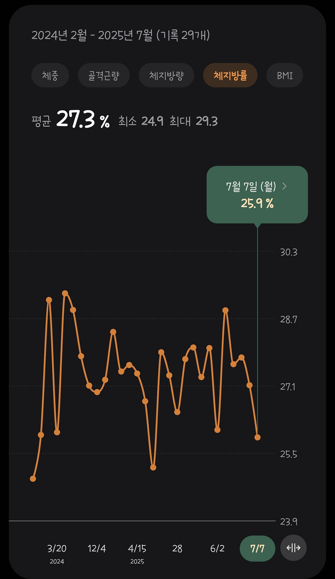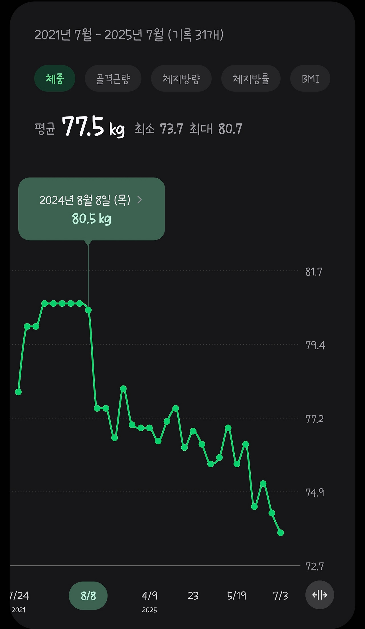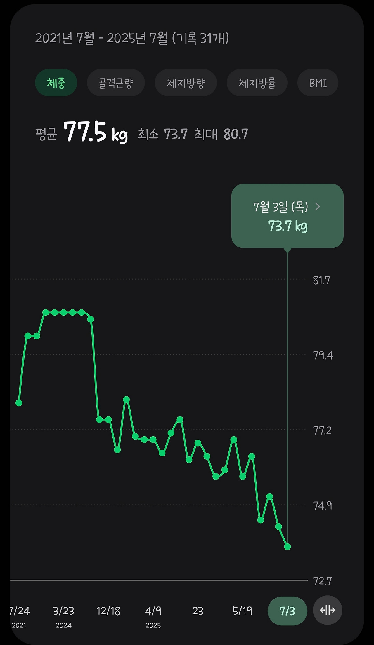가장 확실하게 비교해 볼 수 있는 게 신체 지표일 것이다. 처음 러닝을 시작할 때 이렇게 계속할 줄 알았다면 몸무게를 미리 꾸준히 재봤을 텐데, 처음에는 거의 재질 않아서 일단 있는 자료로 비교해 보면, 러닝 시작 전에 비해 몸무게는 약 7kg가량 감소됐다. 분명 이 무게가 모두 지방은 아닐 것이다.