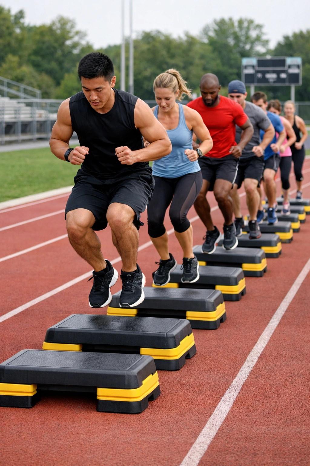 B. 매트/ 스텝박스 점프: 한 발로 뛰고 매트나 스탭박스를 점프해서 두 발로 올라가고 다음 포인트까지 한발 깽깽이로 뛰고 다시 두발로 착지, 발 바꿔서 또 깽깽이로 두 번 뛰고 다시 점프해 두 발로 착지한다.