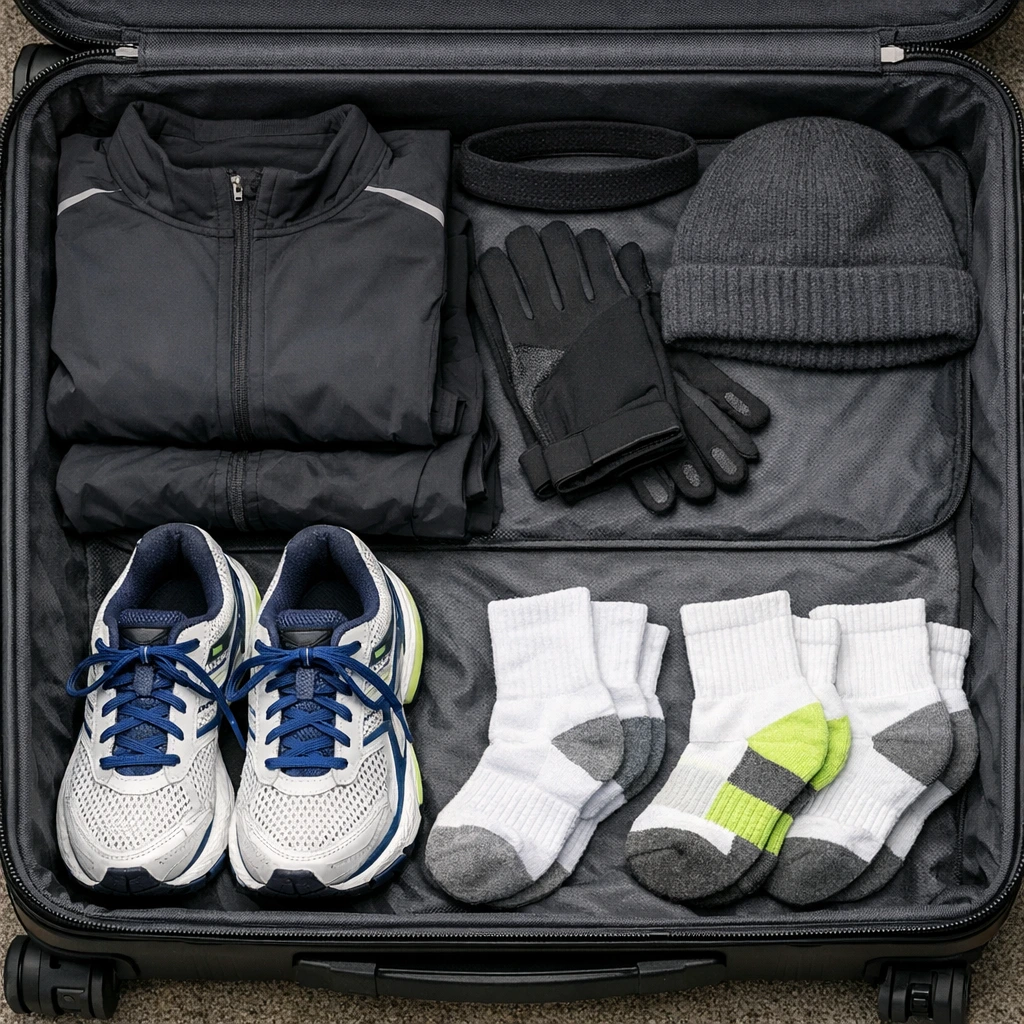 3. 땀 흡수 잘 되는 긴팔 옷, 긴바지 한 세트: 겨울이라 땀이 많이 안 나길 빌며 한 세트만 챙겼다. 혼자 여행이면 몇 벌 더 챙기겠지만 주객이 전도되면 와이프랑 아들램에게 핀잔 듣기 십상이다. 다리엔 땀이 별로 안나 만약 땀이 많이 난다면 뛰고 나서 샤워할 때 상의를 같이 빨고 잘 말리면 건조한 실내를 고려할 때 다음날까지 마르기 충분하다.