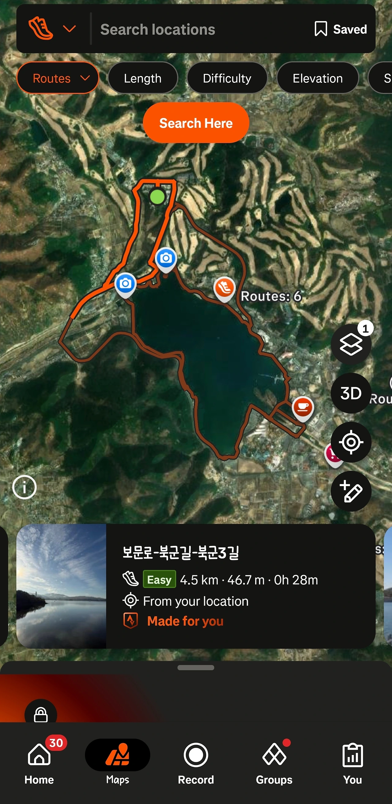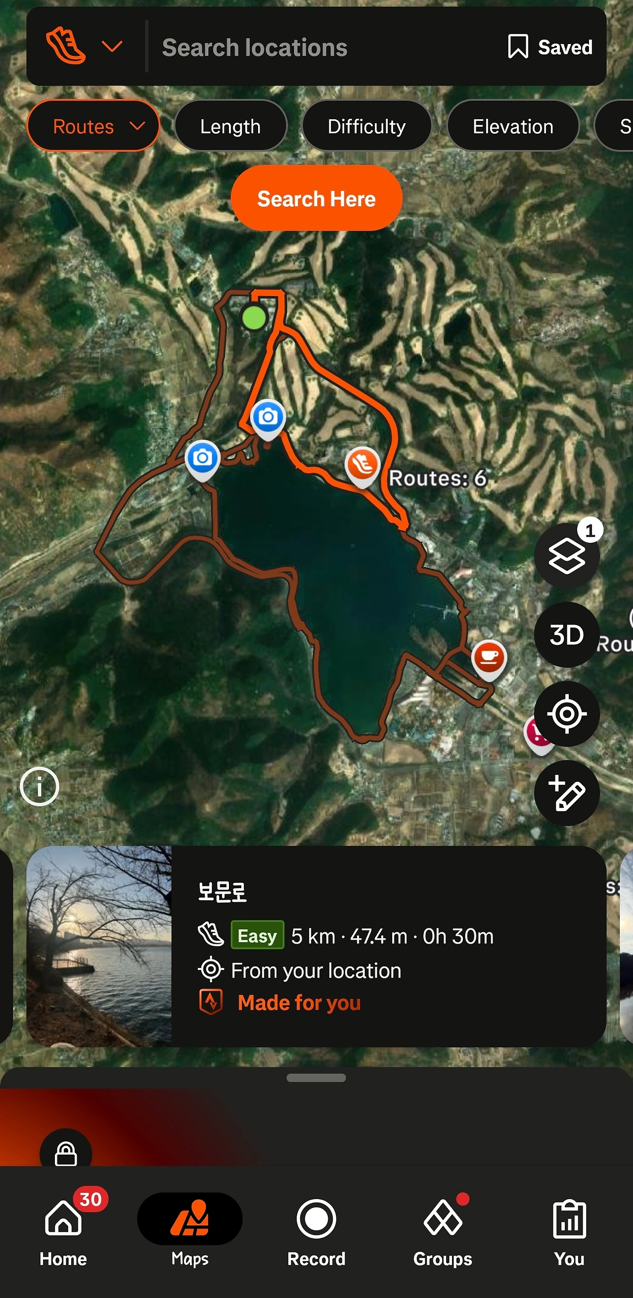 하단에 Maps를 누르면 지금 있는 곳 근처에 괜찮은 코스를 알아서 찾아준다. 말 그대로 made for you이다. 처음 찾아준 4.5km는 첫날 가볍게 뛰는 코스로 정했고