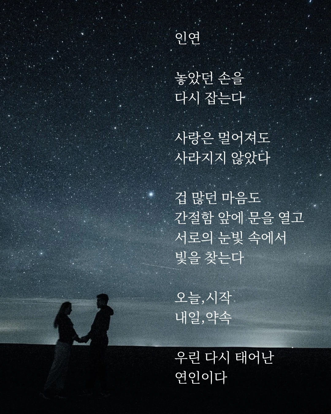 놓았던 손을다시 잡는다.사랑은 멀어져도사라지지 않았다.겁 많던 마음도간절함 앞에 문을 열고,서로의 눈빛 속에서빛을 찾는다.오늘, 시작내일, 약속우린 다시 태어난연인이다.
