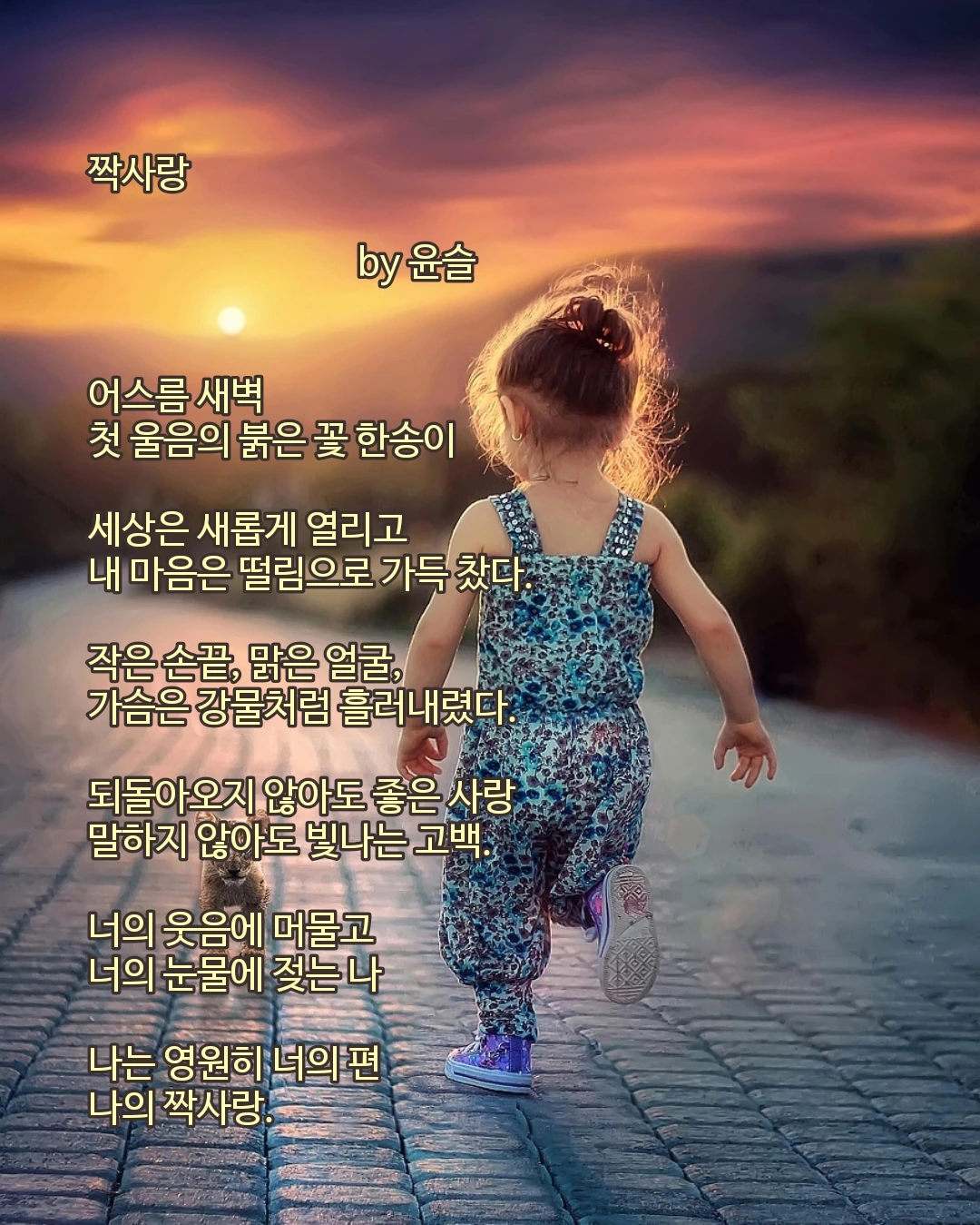 어스름 새벽첫울음의 붉은 꽃 한 송이세상은 새롭게 열리고내 마음은 떨림으로 가득 찼다.작은 손끝, 맑은 얼굴가슴은 강물처럼 흘러내렸다.되돌아오지 않아도 좋은 사랑말하지 않아도 빛나는 고백.너의 웃음에 머물고너의 눈물에 젖는 나나는 영원히 너의 편나의 짝사랑.
