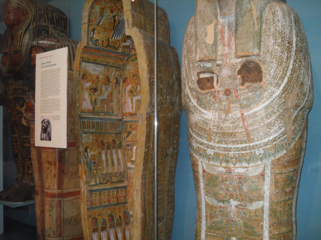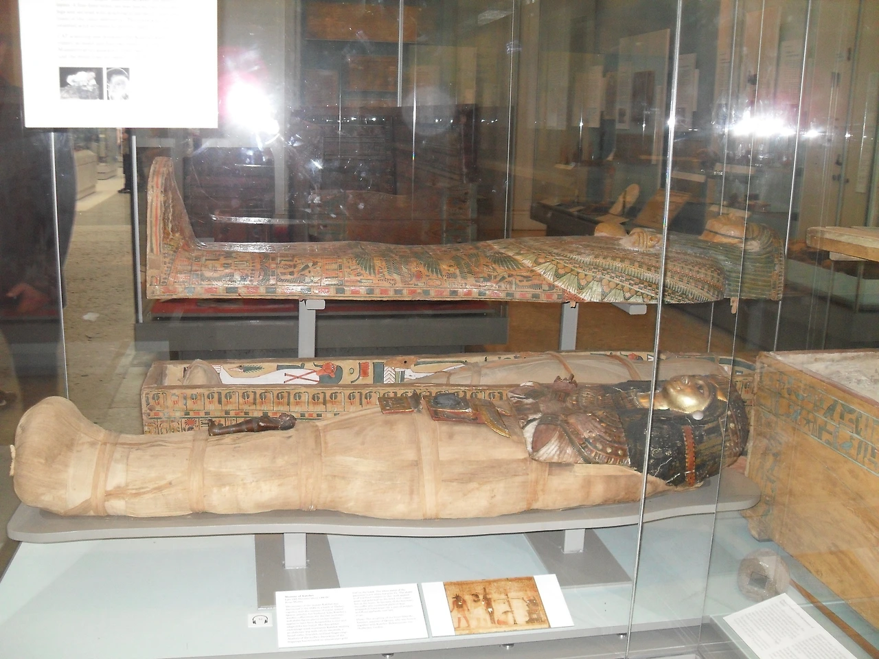 먼저 미이라관부터 보기로 하였는데, 다행히 1층에서 각층으로 엘리베이터가 있었다. 대영박물관은 워낙 오래된 건물이라 처음 지을 때부터 설치된 엘리베이터는 아닌 것으로 보였다. 미이라관에 들어서니 약간 썩은 냄새(무언가 오래된 것 같은 그런 냄새), 마치 수십 년 된 종이 더미가 보관되어 있는 창고에 들어갔을 때 나는 그런 냄새가 났다. 고대 이집트의 각 종 미이라(시체)들과 미이라를 넣었던 통이 전시되어 있었고, 미이라관에서 발견된 뼈만 남은 시체들도 전시되어 있었다. 여기저기 미이라(주로 왕이나 왕족임)들이 말없이 관객들을 기다리고 있었는데, 수백 년 동안 말없이 세계 각국의 방문객을 맞이하였을 텐데 앞으로도 얼마동안 관광객들 앞에서 모습을 드러내놓고 있어야 할까, 이집트인들은 당시 영혼 불멸사상이 있어서 미이라를 만들었다는데, 만약 그들의 믿음대로 그들의 영혼이 살아 있다면 고국인 이집트를 떠나서 머나먼 영국에 누워있는 그들의 마음은 어떠할까? 미이라를 만드는 과정이나 도구들도 전시되어 있었는데, 대영박물관은 다행히 내부에서 사진촬영이 허락되어 미이라전시물 앞에서 사진 촬영 한판하였다. 스핑크스 석상도 여러 개 보였음.