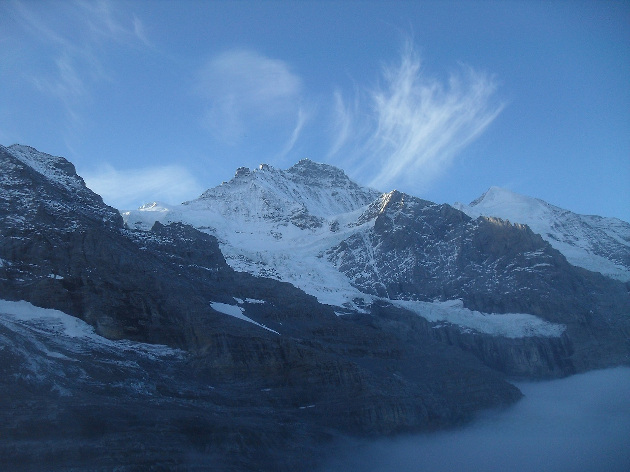 다음날 늦을까 봐 잠을 자는 둥 마는 둥 하고 새벽에 일어나 여행사버스로 인터라켄역에 도착하였다. 인터라켄역은 아직 해가 뜨기 전이다. 새벽열차를 타고 융프라우로 올라가는 중간중간 열차 길 옆으로 그림 같은 집들이 펼쳐있다. 들판에는 양들이 풀을 뜯고 있다. 농가주택들은 모두 국유공원 내에 있기 때문에 디자인, 모양 색깔 등에서 규제를 받는다고 한다. 산악열차의 일부 구간은 산 중간에 뚫린 터널을 통과하여 올라가게 되어 있다. 올라가는 열차길 옆으로 흐르는 작은 냇물은 빙하가 녹아내려 흐르는 물인데 약간 회색을 띠고 있다. 첫 번째 터널을 지나니 갑자기 만년설이 펼쳐진다. 여간해서 감탄을 하지 않는 내 입에서 감탄사가 저절로 나온다. 빨간색 기차를 타고 가다 노란색기차로 갈아탄 것으로 기억되는데 지금은 곤돌라를 이용할 수 있어 융프라우 정상까지 가는데 시간이 단축된다고 한다.
