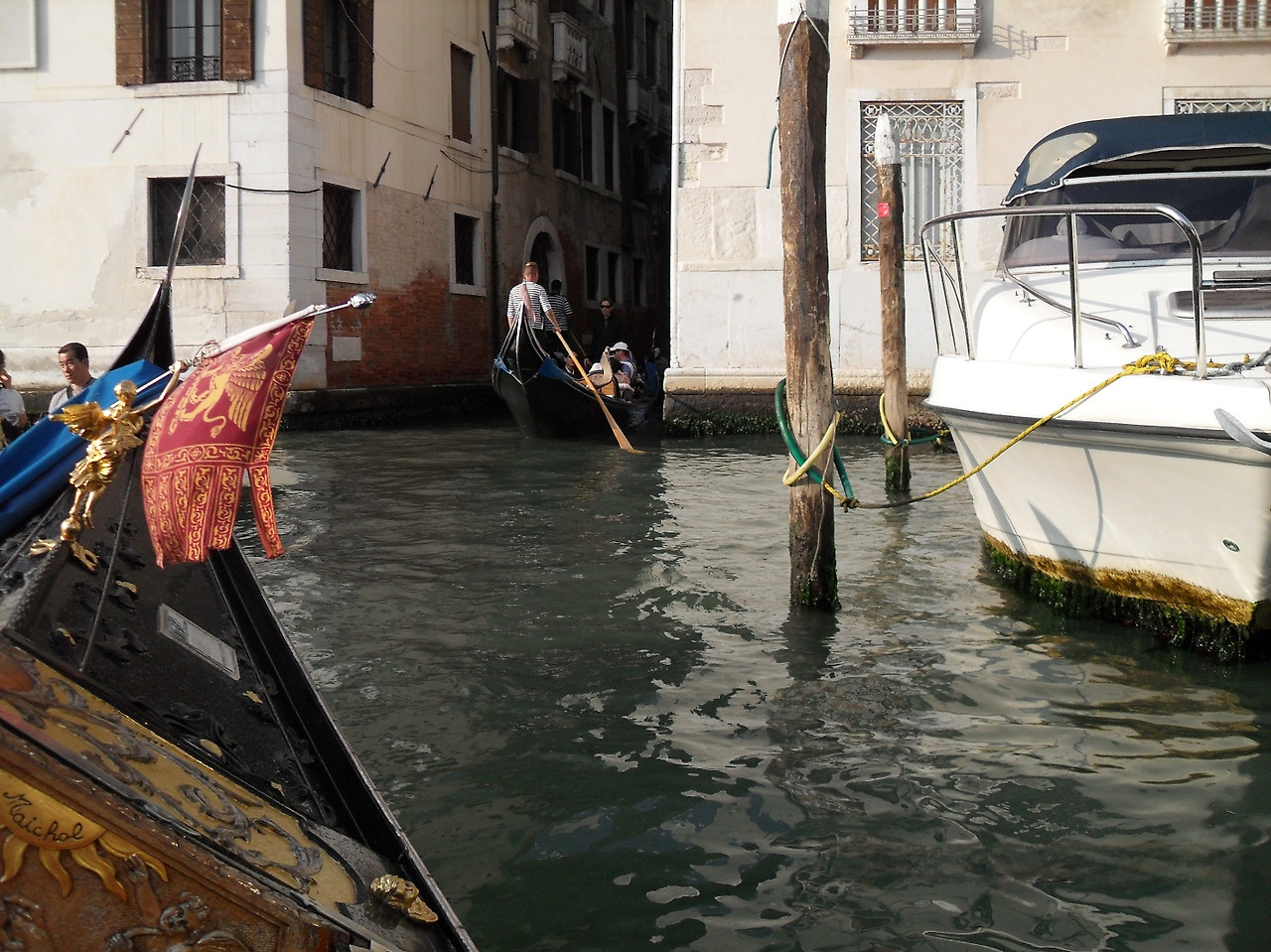선착장에 가니 예약한 곤돌라가 아직 오지 않았다. 40분 이상 기다렸고 드디어 예약한 곤돌라가 왔다. 곤돌라 운전자(우리말로 하면 뱃사공이다)는 흰 바탕에 검은 줄무늬의 상의를 입고 있다. 여기서 곤돌라 운전자는 자격증을 있어야 하고 고수입 직종이어서 여기 젊은이들에게는 선망의 직종이라고 한다.
