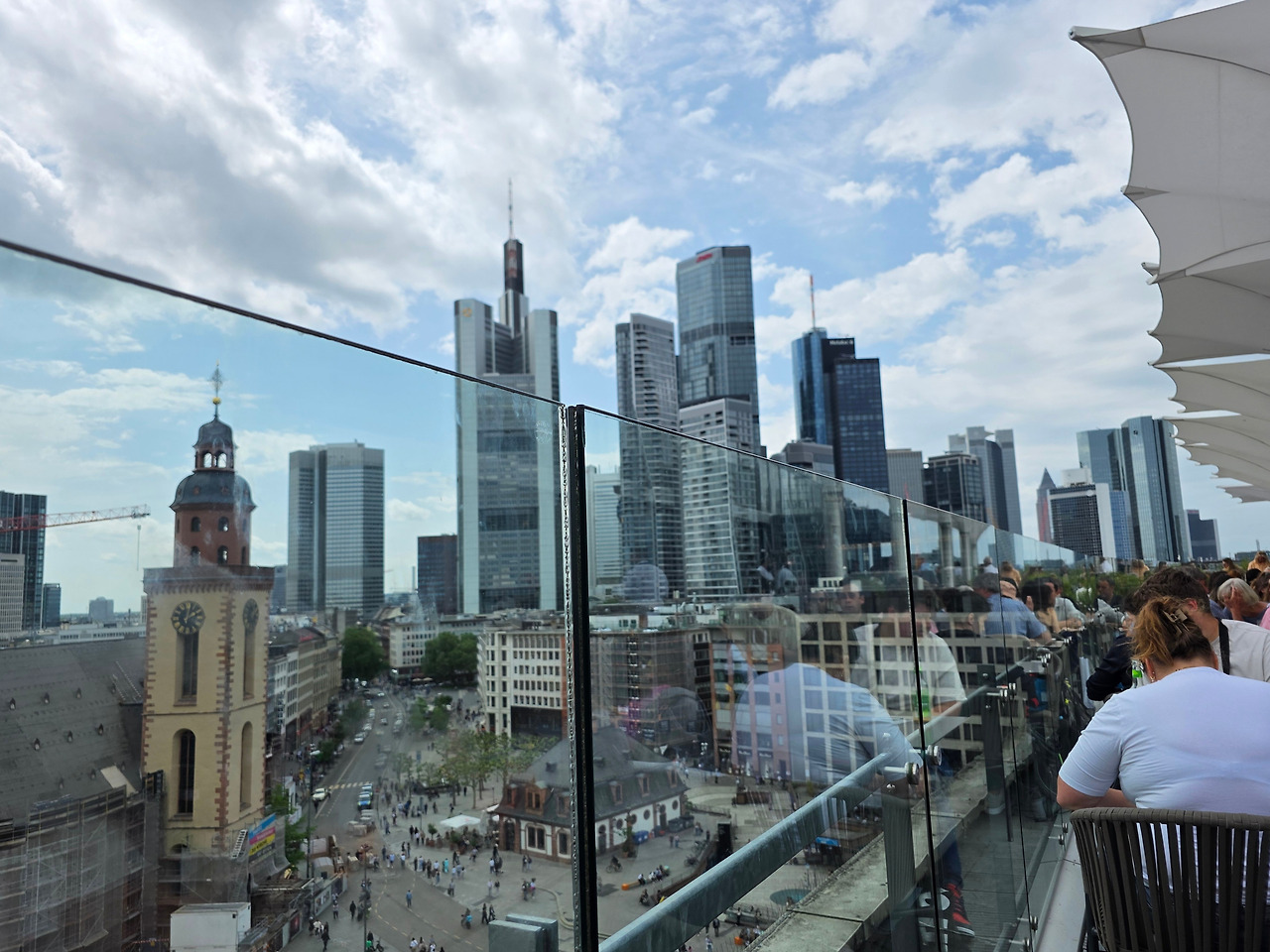샐러드를 주문하였는데 6.5유로, 결코 비싼 음식이 아니었다. 나온 샐러드는 내용물이 풍부하다. 내가 좋아하는 스타일이다. 생선을 파는 코너가 있으면 조금 더 먹을까 살펴보니 보이지 않는다. 돼지고기나 치킨을 튀긴 음식은 보이지만 내키지 않는다. 한 코너 직원에게 Fish가 있느냐고 물으니 Salman 이라며 연어덩어리를 보여주는데 혼자 먹기에는 양이 너무 많다. 절반만 파느냐고 하니 절반은 팔지 않는다고 한다. 여기서 파는 음식은 모두 신선하고 품질이 좋다. 별로 비싸 보이지는 않는다. 식사 후 테라스가 있는 커피숍으로 갔다 이 커피숍에서는 프랑크푸르트 시내 전망을 볼 수 있었다. 고층건물이 몇 개보이지만 대부분이 낮은 건물이어서 답답하지 않았다.