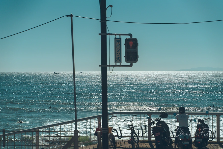 저 바이크에 앉아 있는 여행자도 드넓은 에노시마 바다를 감상하고 있는 것이겠지?