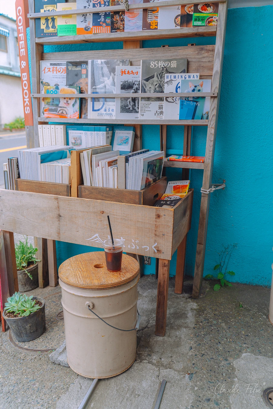 나무 선반에 일본어가 가득 쓰여있는 잡지들을 꽂아놓은 책장뿐.