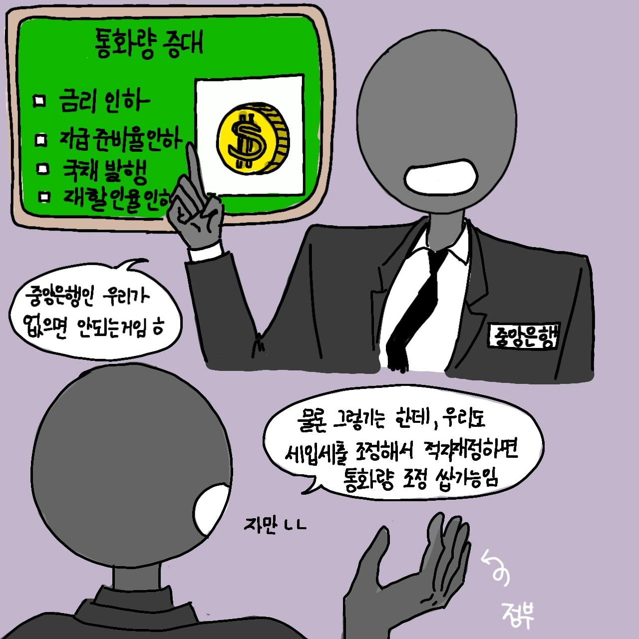 위의 방식 중1~4는 중앙은행이, 5는 정부가 주도하는 것입니다. 따라서 1~4에 해당하는 방식은 통화정책, 5에 해당하는 방식은 재정정책이라고 부르는 것이죠!