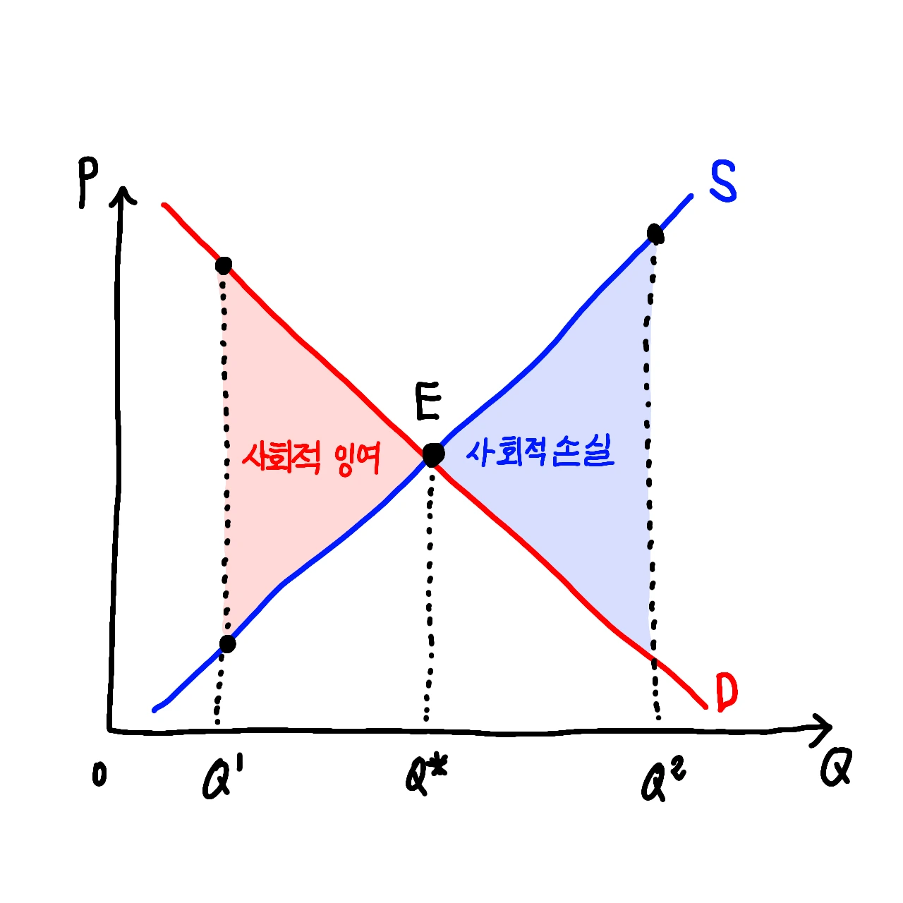 CASE 1에서는 효용이 비용보다 더 크기 때문에 사회적 잉여가 발생하고, CASE 2에서는 효용보다 비용이 더 크기 때문에 사회적 손실이 발생하게 됩니다, 즉, Q1일 경우 효율성이 극대화되는 지점인 Q*까지 추가 생산을 하여야 하며, Q2일 경우 역시 효율성이 극대화되는 지점인 Q*까지 생산을 줄여야 하는 것입니다, 즉 사회적 잉여가 극대화되는 생산량은 Q*와 P*가 만나는 지점이며, 이 지점을 균형점, ‘E”라고 할 수 있습니다,