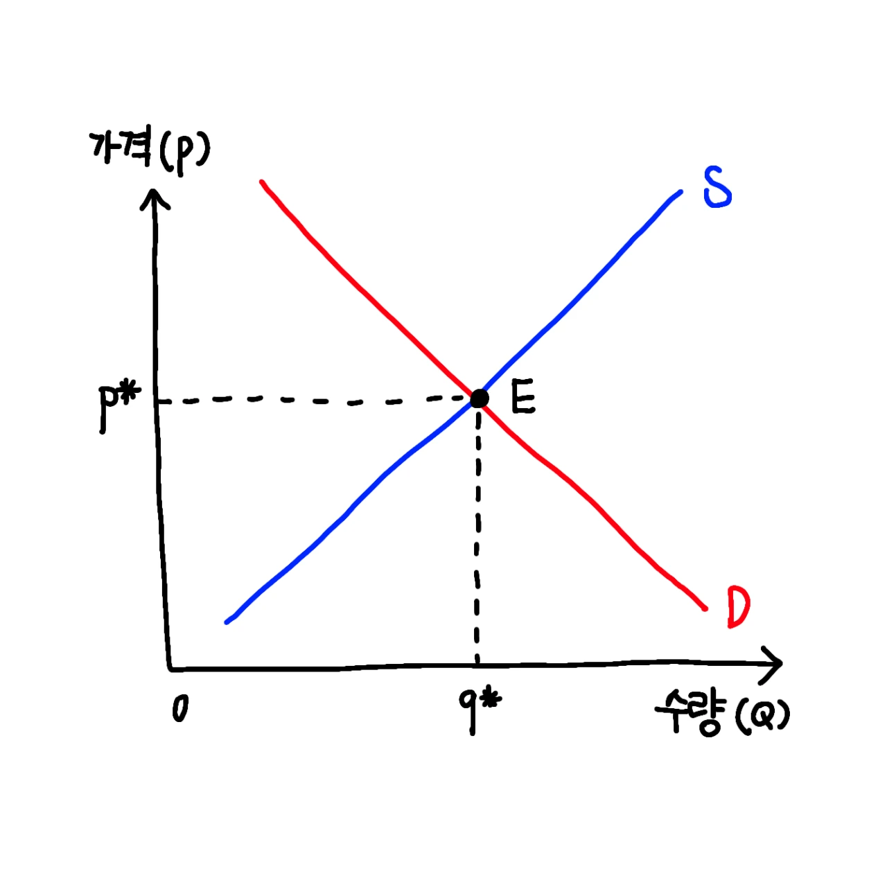 완전경쟁시장에서는 사적이익을 추구하는 소비자와 생산자가 자신도 모르게 사회적 잉여를 극대화합니다. 그래프를 통해 살펴보도록 하겠습니다.