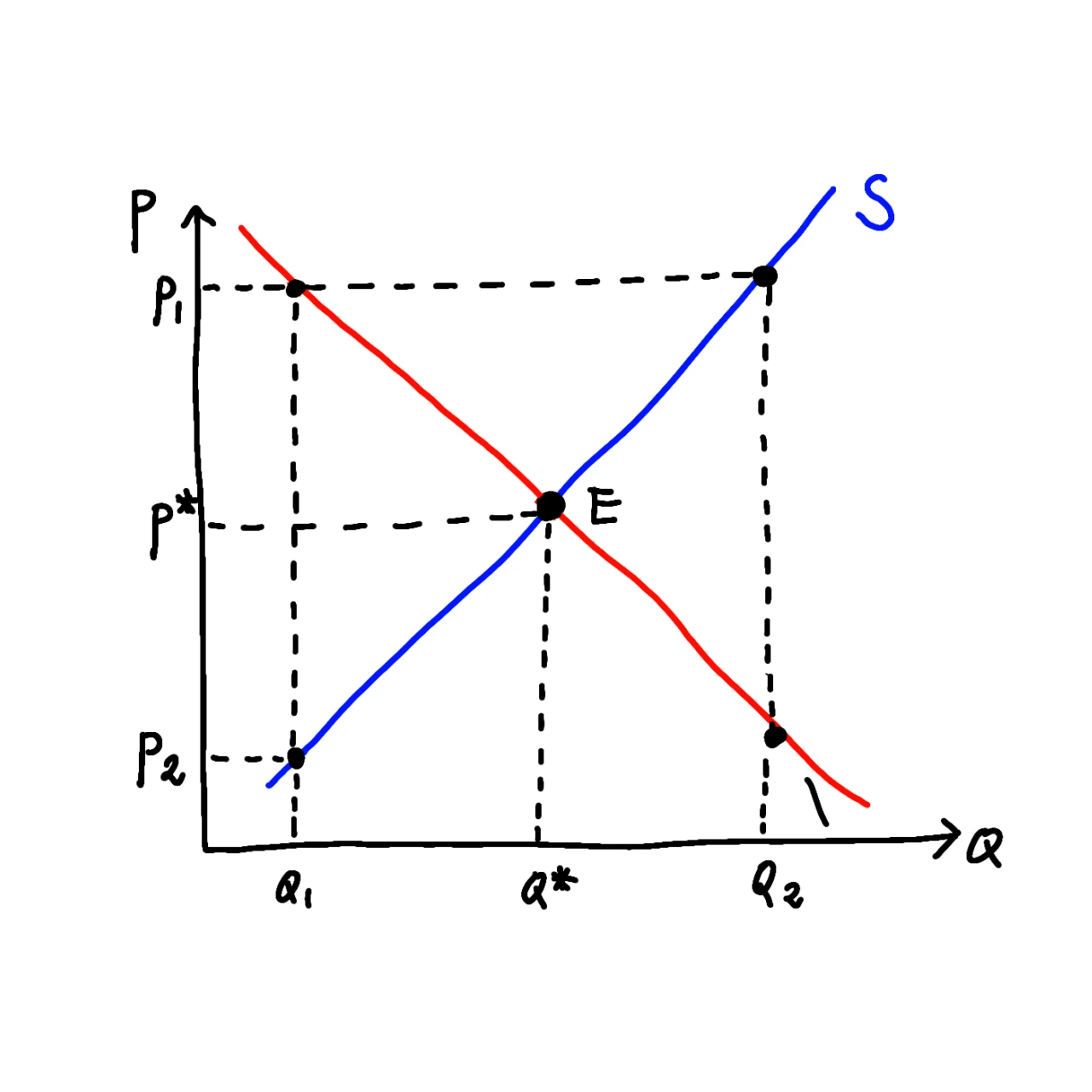 P1의 경우 가격이 높기 때문에 수요는 상대적으로 적어 공급이 수요보다 많은 상태, 즉 초과 공급이 발생하게 됩니다. 이 경우 완전경쟁시장에서는 재고 누적이 발생하면 가격이 하락하여 수요량이 증대하고 공급량이 감소하여 궁극적으로는 균형으로 다시 돌아가게 됩니다.