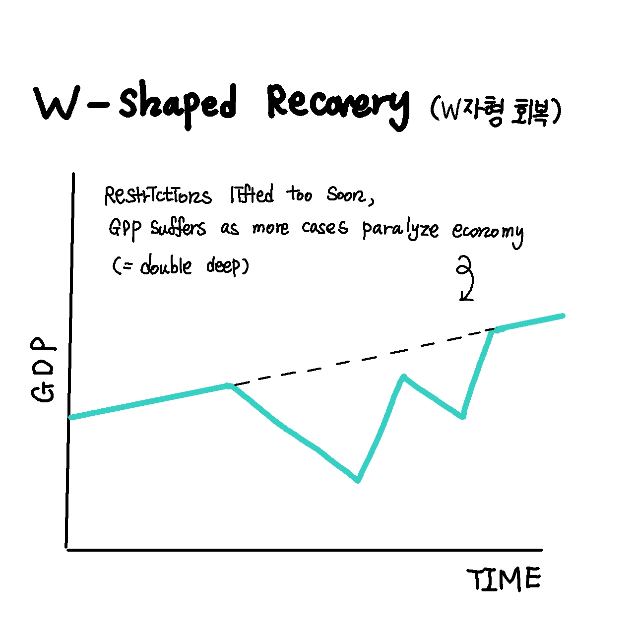 W자형 경기회복은 일본 경제를 설명하는 뉴스나 책에서 가끔 활용되는 개념으로 일반적으로 '더블딥(double dip)'이라고 불리는 개념입니다. w자형 경기회복을 보이는 경제는 재정 정책이나 통화정책의 실행으로 경기가 일시적으로 회복되다가 다시 침체되게 되며, 이후 실물 경제나 소비, 투자의 활성화에 상당한 시간이 소요된다는 점에서 경기 회복 전 하강기가 2번이나 발생하기 때문에 W자형 경기회복, 즉 '더블딥' 불황이라고 불리는 것이죠.