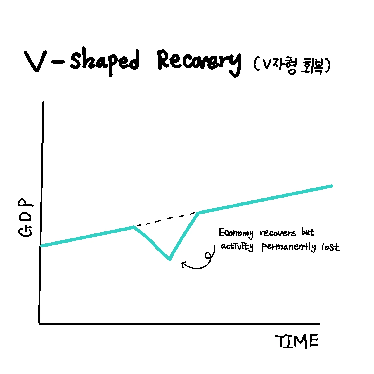 V자형을 그리며 경기가 회복되는 경제에서는 경기 회복 전 급격한 하락세를 경험하게 되는데요, 이러한 급격한 상승세로 인해 최저점을 찍은 후에는 거의 즉시 반등세를 보이며 급격히 상승곡선을 그려며 빠른 시간에 경기 침체 전의 수준으로 반등하게 됩니다. 즉 이러한 회복세를 보이는 경제는 경제 침체의 최저점에서의 체류 기간은 매우 짧게 나타납니다.