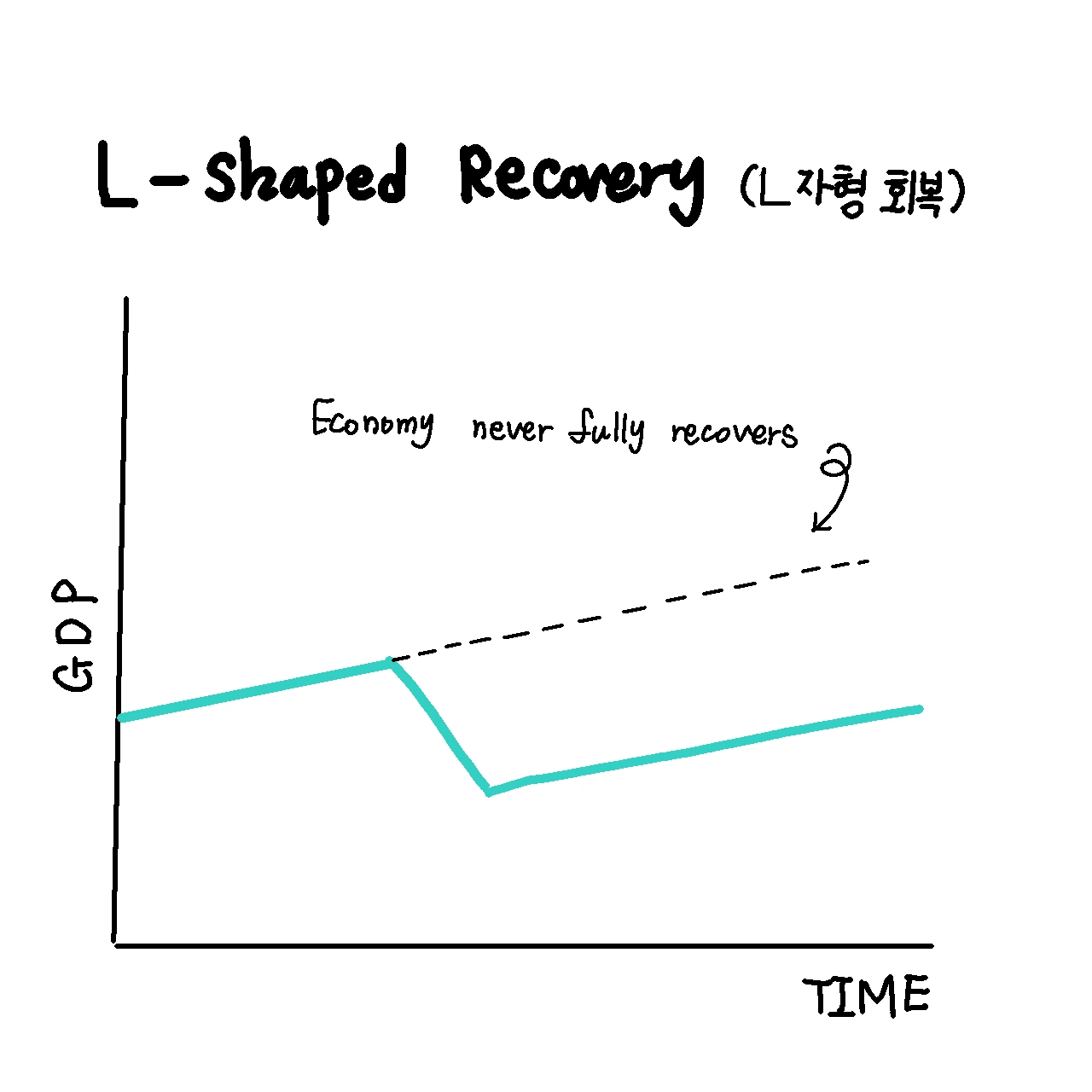 가장 최악의 시나리오라고 할 수 있는데요, 알파벳 모양만 봐도 대충 감을 잡을 수 있듯, 회복세 없이 침체기를 지속하게 되는 경우를 말하는 모형입니다. L자형 경기회복은 '경기회복'이라기보다는 '경기침체'라고 하는 것이 조금 더 적절할지도 모르겠습니다. 1990년대부터 장기적 불황에서 벗어나지 못하고 있는 일본의 '잃어버린 30'년을 통상 L자형 경기회복(경기침체)라고 부를 수 있는 것이죠