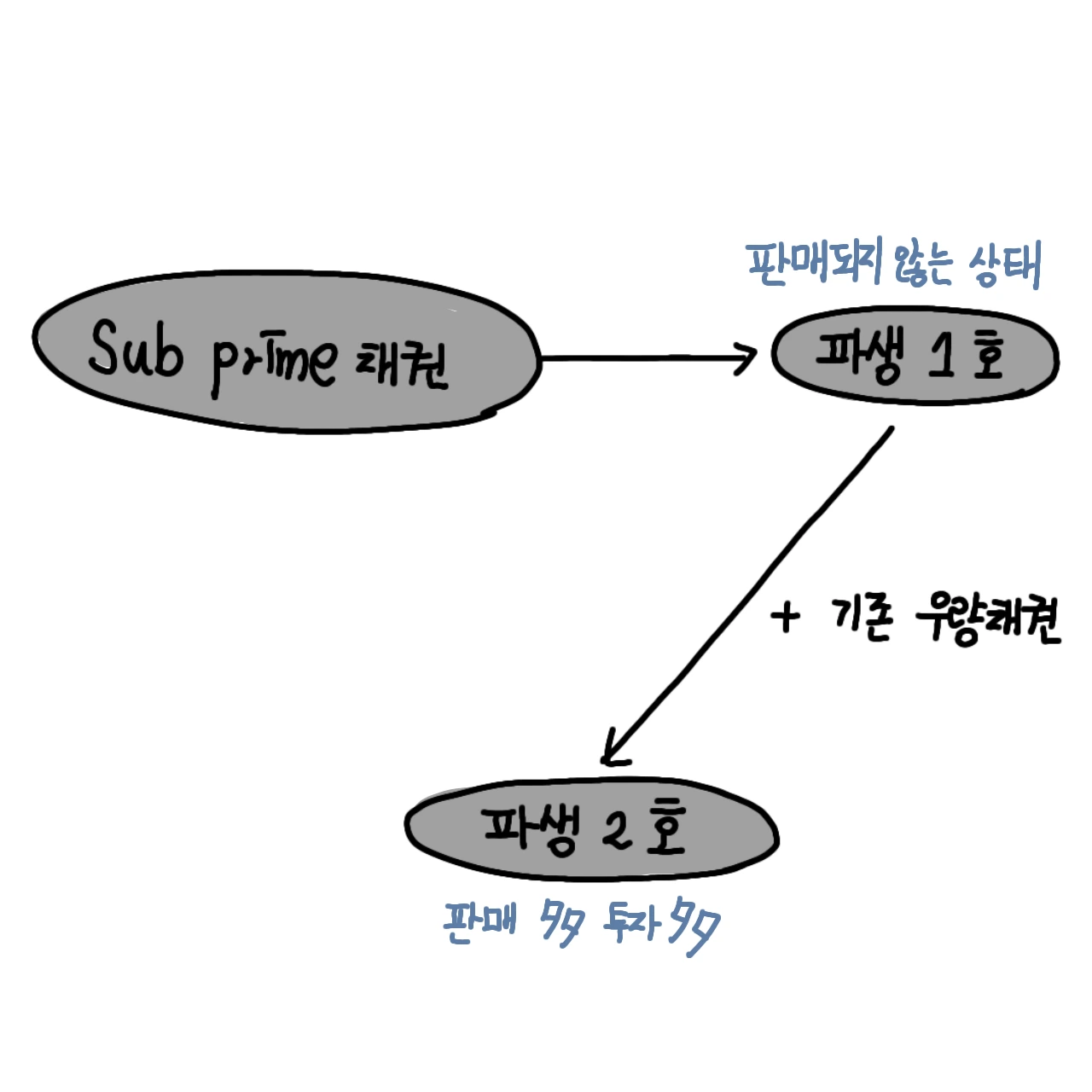 이렇게 구매한 sub-prime 채권은 파생상품으로 제작되어 판매되기 시작합니다. 그러나 파생 1호는(sub-prime채권에서 어떠한 정제 과정도 없이 파생된 상품) 리스크가 크고, 수익률과 금리가 높은 즉 'high risk & high return"의 상태이기 때문에 시장에서 잘 판매되지 않습니다.
