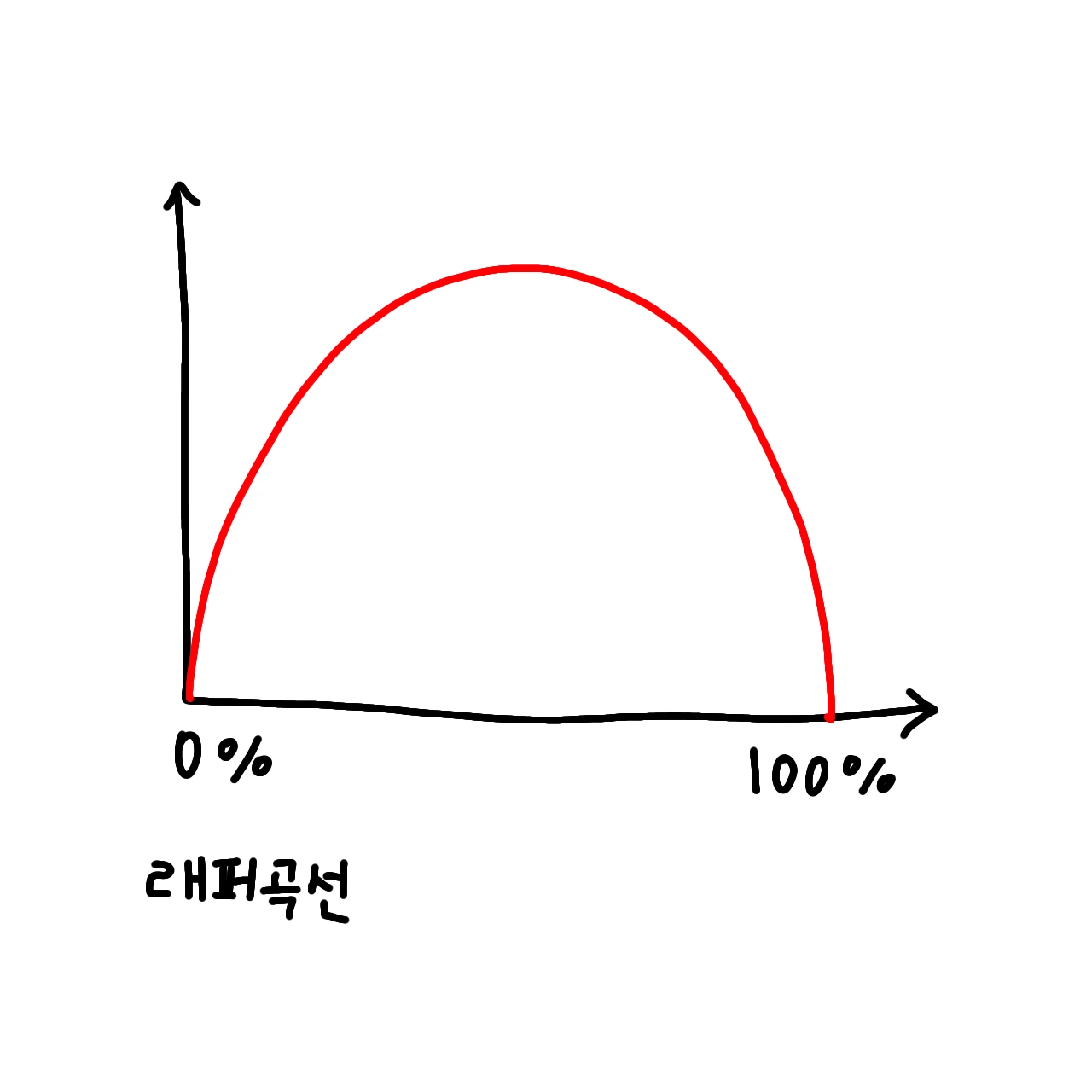 래퍼곡선에 따르면 세율이 0%, 100%인 경우의 조세수입은 모두 0입니다.세율이 지나치게 높거나 낮은 경우에는 오히려 조세수입이 감소하게 되는 것이죠!