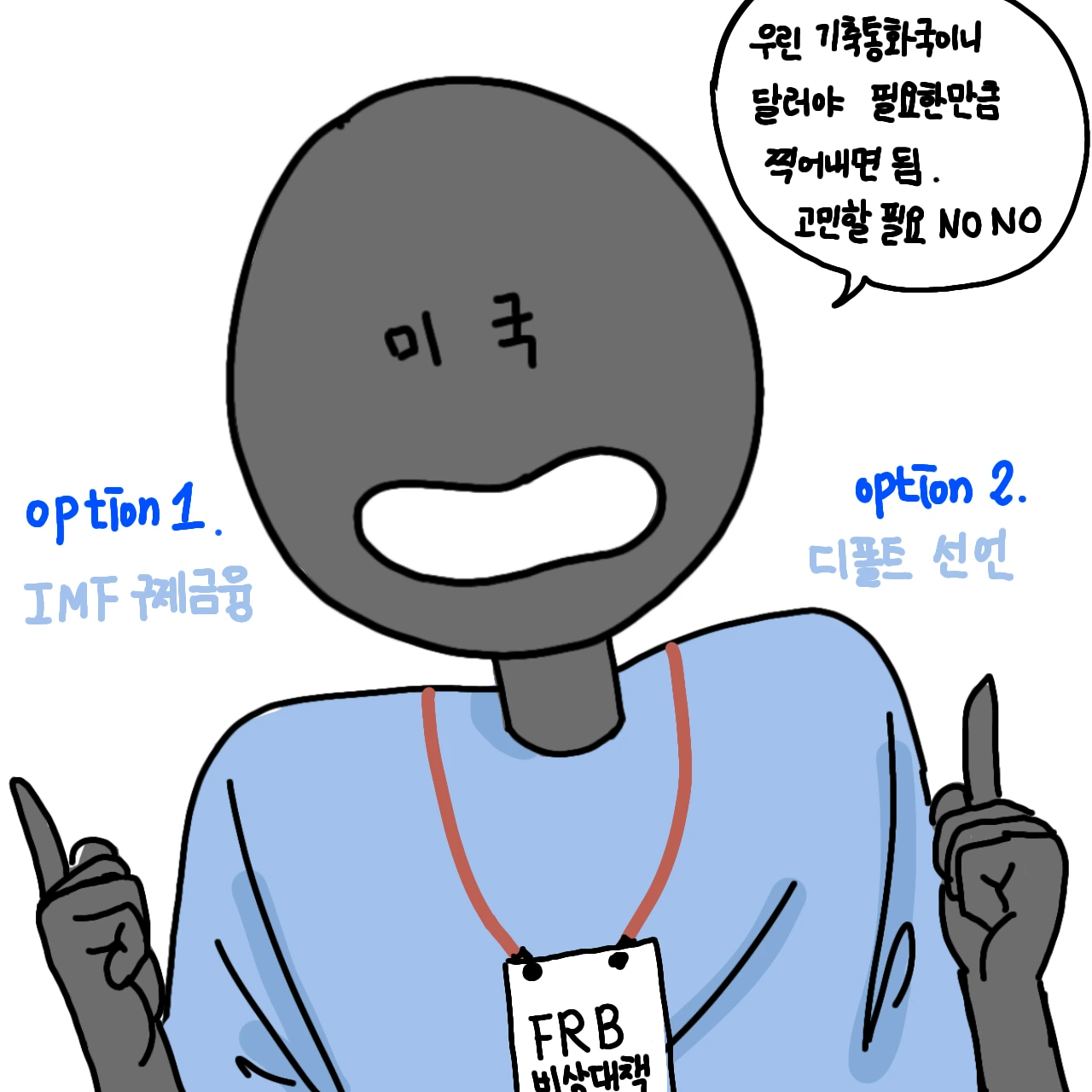 그러나 미국의 경우, 쌍둥이 적자의 발생에도 해결책인 디폴트 선언과 IMF 구제금융, 그 어느 것도 선택하지 않는 모습을 보이게 됩니다. 미국은 달러의 발행국이기 때문이죠. 달러의 발행국인 미국은 자체적 달러 유통이 가능하기 때문에 원하는 만큼의 돈을 생산할 수 있기 때문입니다.