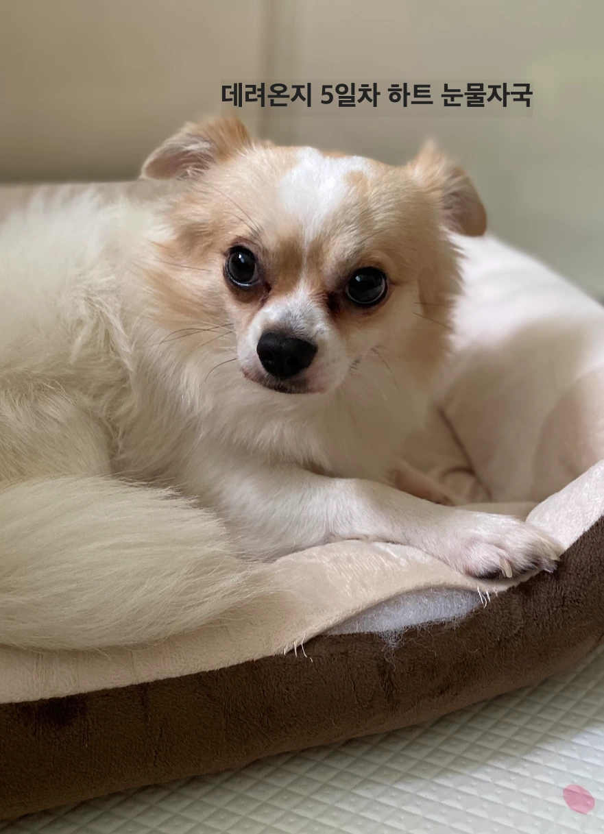 눈가를 닦는 강아지용 세척액을 썼었는데 그래도 눈물자국이 사라지지 않았다. 그래서 알레르기가 있는 아이들이 먹는 사료를 찾아서 먹이니 정말 많이 깨끗해졌다. 그리고 간식도 알레르기를 유발하지 않는 야채를 주었다.