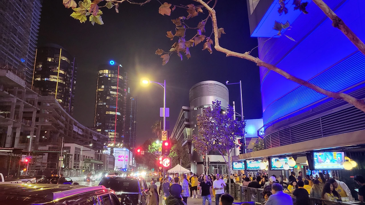 길거리에는 많은 사람들이 노란 LA Lakers 유니폼을 입고 있었다.