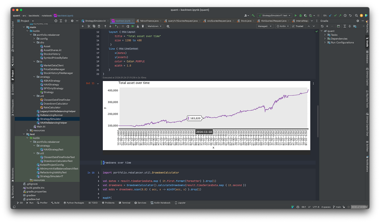 하다 보니 시중에 있는 유료 백테스팅 도구 대신 내가 직접 만들어서 마음껏 백테스팅해야겠다는 생각이 들었고, 최근에 나온 기능인 Kotlin Notebook을 활용하여 백테스팅 스크립트도 작성하기로 했다. 사실 이런 곳에는 주로 파이썬을 많이 사용하지만 업무에서 사용하는 언어인 코틀린에 가장 익숙하기 때문에 코틀린을 사용하기로 했다. 실제로 전략을 구현하다 보니 전략에 대해 애매하게 이해했던 부분이 확실하게 이해가 되었고, 개발 도중 드는 의문점들을 검색을 통해 해결해나가다 보니 지식의 공백이 채워져서 좋았다. 내 대부분의 자산을 몰빵 하는 데 사용할 전략이라면 깊게 이해할 필요가 있다고 생각한다. 그래서 논문도 모두 읽고, 직접 구현하는 과정은 필수라고 생각했다.