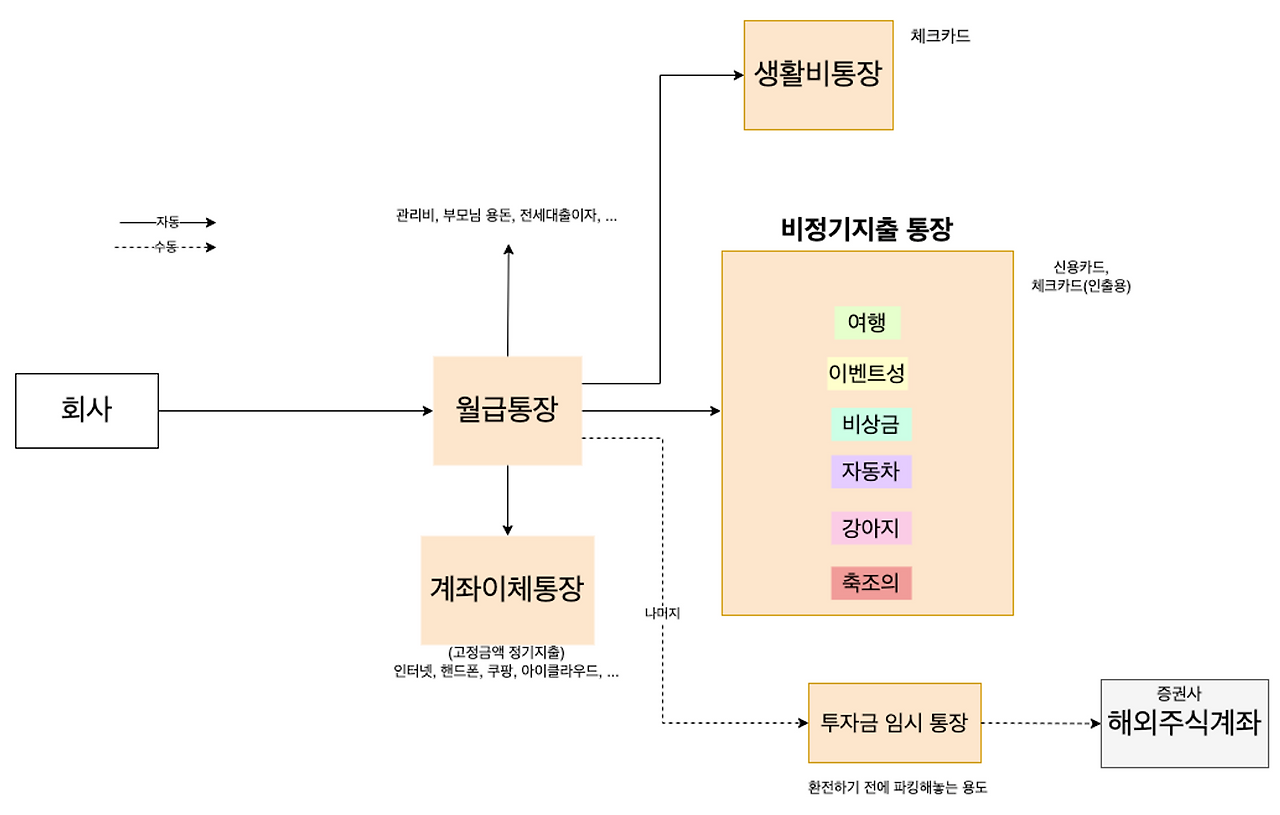 나는 우선 크게 아래의 5개의 통장을 사용한다. 위의 그림에서 주황색 네모에 해당하는 부분이다.