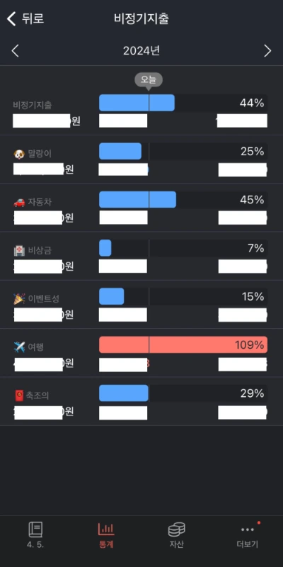그리고 사실 비정기지출 통장의 경우 처음에는 토스뱅크의 ‘나눠 모으기’라는 기능을 사용하여 더욱 세분화하여 따로 나눠 보관하려고 했다. 이렇게 하면 각 카테고리별로 잔액이 명확히 분리되어 보여서 가시성이 높아지기 때문이다. 그런데 몇 가지 문제가 있었다. 특정 카테고리의 지출을 하기 전에 직접 사용한 금액을 토스뱅크 통장으로 빼야 했다. 항상 일정 금액을 유지하여 결제한 뒤에 사용한 금액만큼 이체해 줄 수도 있었지만 그래도 귀찮은 건 여전했다. 결국에는 연 2%의 이자를 주는 토스뱅크 통장에 모든 카테고리에 해당하는 금액을 모아두고, ‘편한가계부’라는 앱의 연간 예산 기능을 사용하여 가시성을 확보하여 보완하기로 했다.
