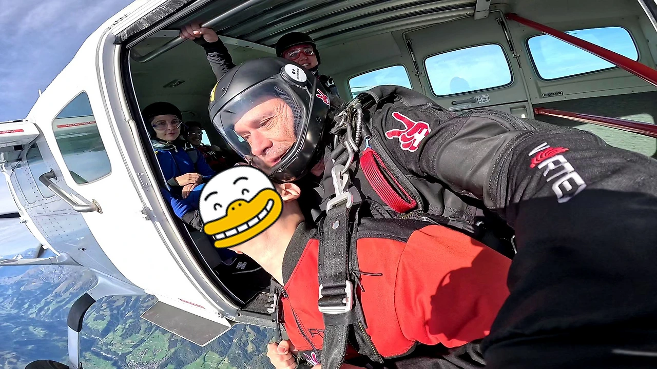 여운이 가시지 않았는지 연신 '와..'라며 감탄하는 표정만 봐도 그의 기분이 온전히 느껴졌다. 나도 한껏 기대되는 마음으로 활주로와 잔디밭을 가로질러 경비행기 쪽으로 걸어갔다. 출발하기 전에 나와 매칭된 전문 다이버가 액션캠으로 나에게 소감을 묻는 영상을 찍었다. 지금 기분이 어떠냐고 물어봐서 '약간 긴장되지만 분명 재미있을 것 같다'라고 했고, 다이버는 '당연히 그럴 거다'라고 했다. 들어보니 이 다이버 분은 1,000번 이상을 뛴 베테랑이라고 했다. 겉보기에도 다른 다이버들보다 훨씬 연륜이 있어 보였다. 경비행기 앞에서 마지막으로 한 마디를 하는 모습을 찍고 경비행기에 올라탔다.