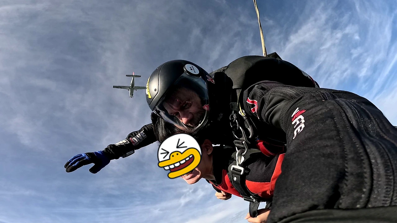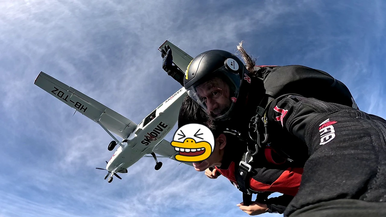 바로 이어서 나와 함께하는 다이버가 뒤에서 나를 안고 앉은 상태로 문 앞으로 갔다. 그리고 나는 배운 대로 양손으로 어깨끈을 잡고 고개를 뒤로 젖히고 스마일을 했다. 그리고는 바로 점프! 점프하는 순간부터 놀이기구를 탈 때 그 간 떨어지는 느낌보다 강한 느낌이 약 십 초 간 이어졌다. 그리고 나는 입을 벌리지 않으려고 안간힘을 썼다. 여행 준비 당시 유튜브로 스카이다이빙 후기를 찾아봤었는데, 입을 벌리면 엄청난 양의 공기가 입안으로 들어가고, 입안의 수분을 금세 마르게 해서 입 안이 따갑다는 것이었다(이러한 모습이 나중에 영상에 그대로 찍혔는데 굉장히 웃기고 추했다..ㅋㅋ).