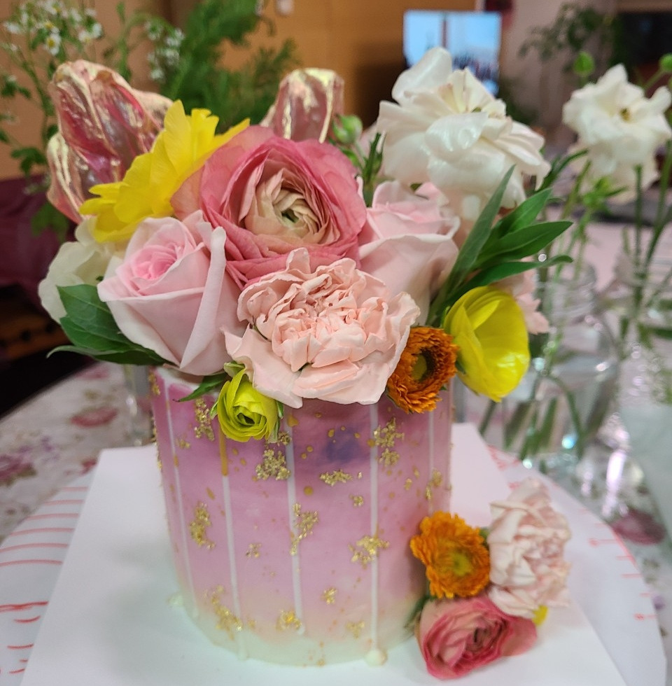 조카의 생일에는 분홍 장미와 금분이 가득한 화려한 꽃케이크를 만들어 주었다.