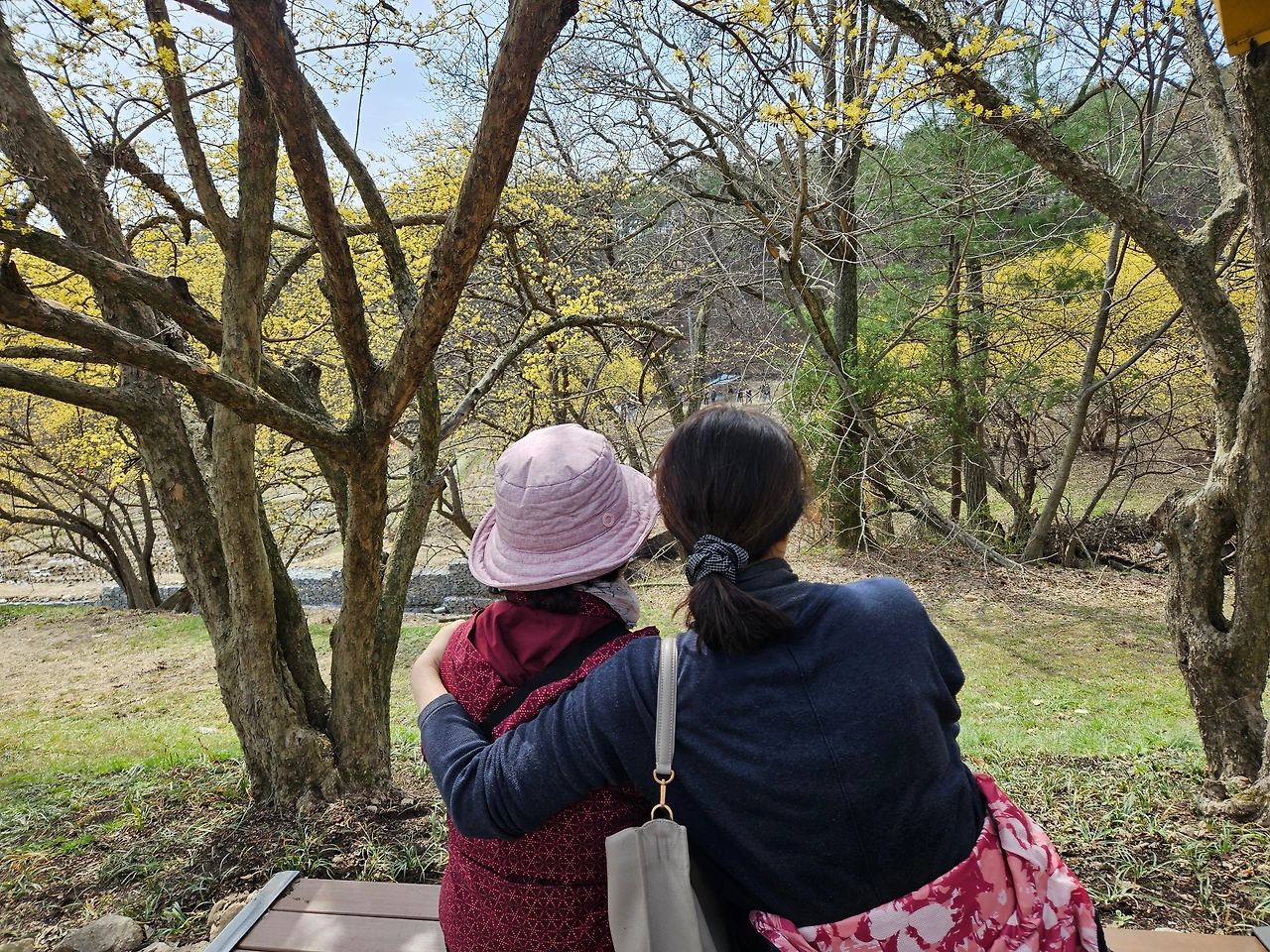 노란 산수유꽃을 배경으로 사진 찍기 놀이를 하며 ㅡ
