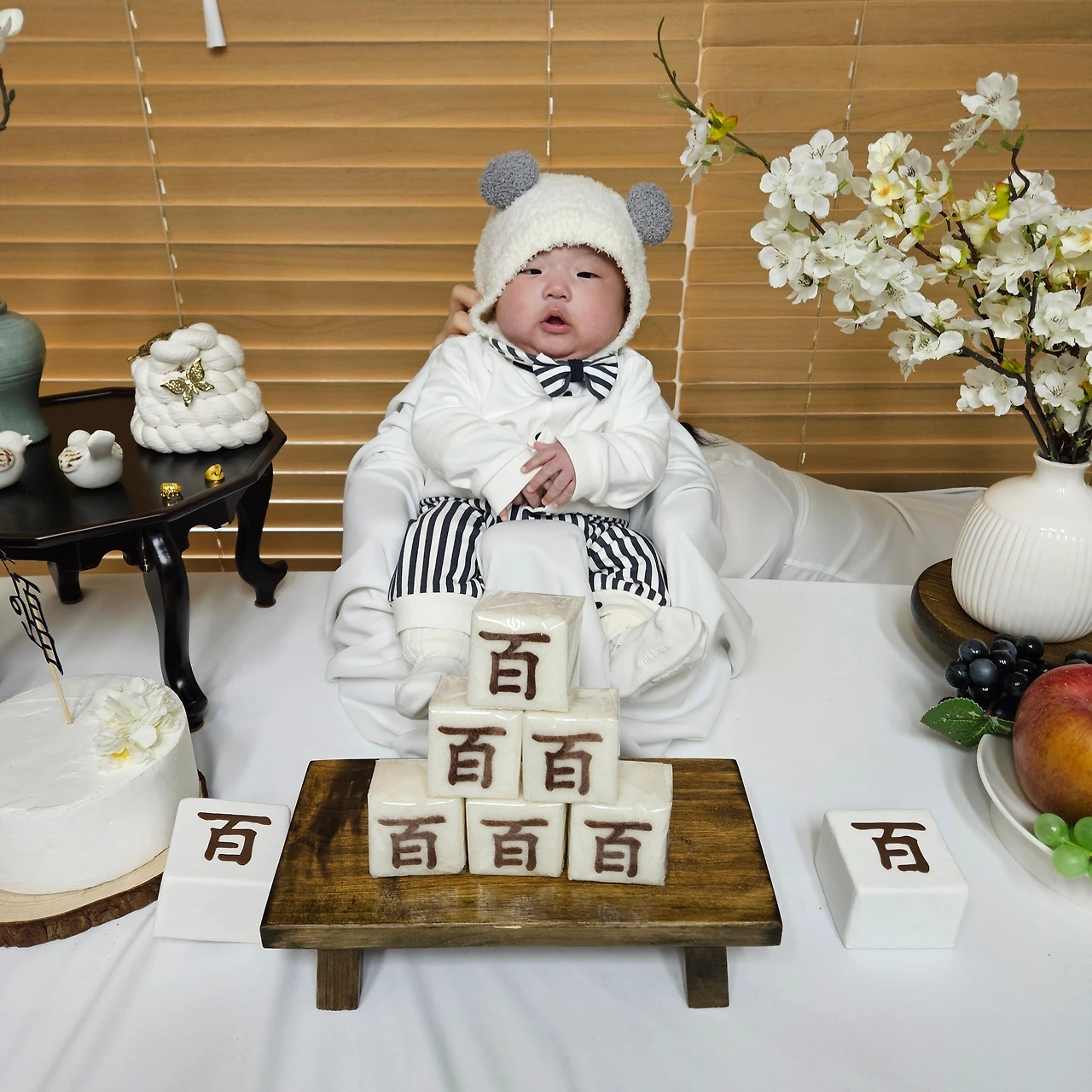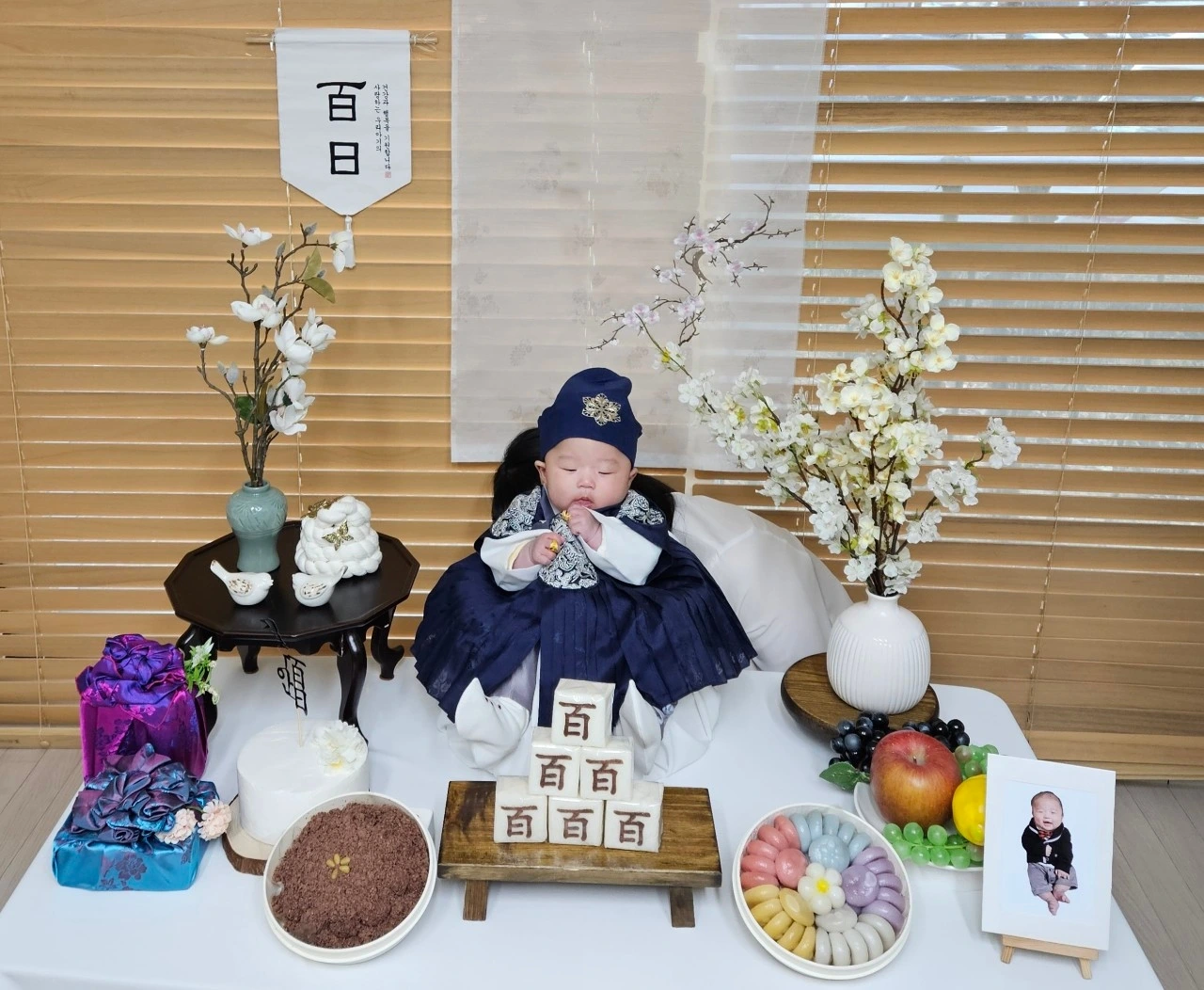 아가의 행복과 건강을 기원하는 백일상을 차려주고 가족들과 작은 행사를 하였다.