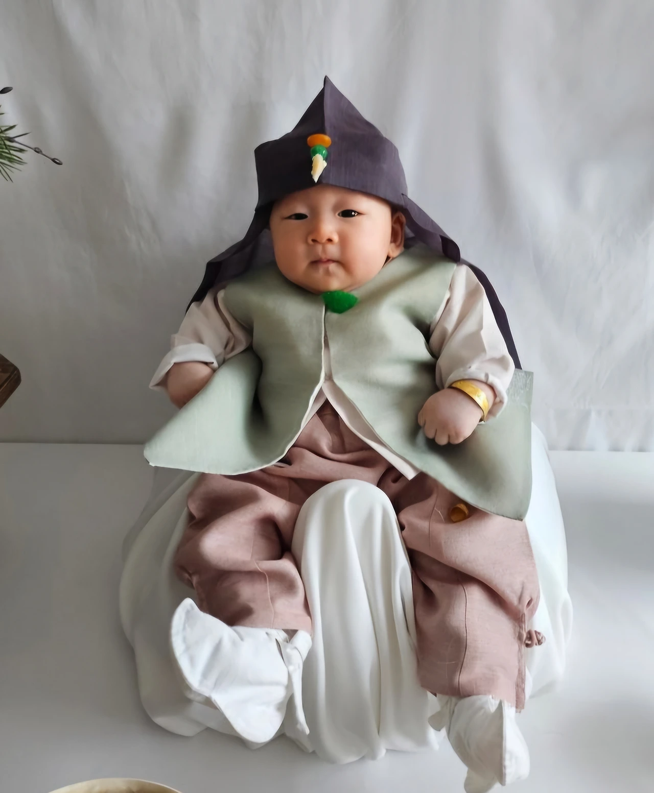 짙은 남색 전통 모자는 아가의 얼굴을 하얗게 돋보이게 하였다