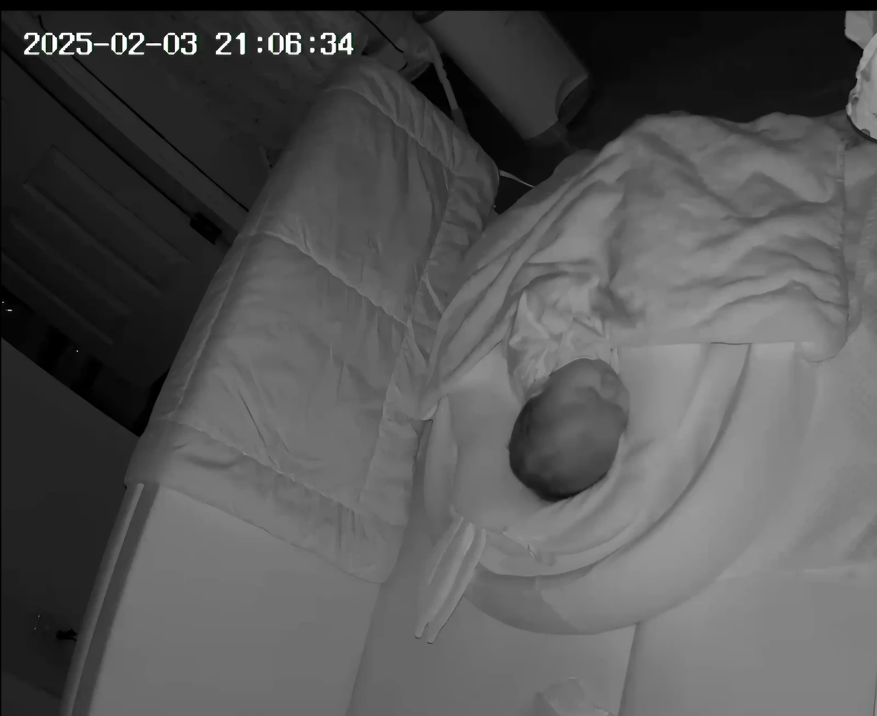 어두운 안방 아가 침대에서 아가가 자는 모습이 보인다.