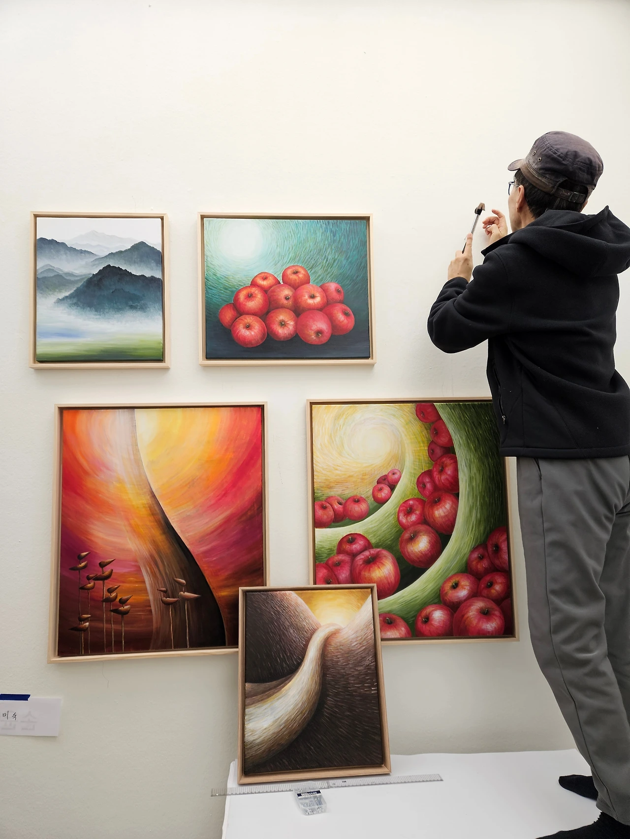 작품을 적당한 높이에 못질을 하고 걸었다.